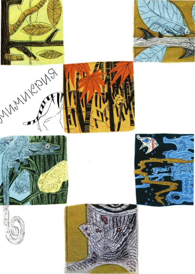 4. Одно из самых удивительных приспособлений, которое появилось у разных живых существ в борьбе за существование, называется — мимикрия. Точный перевод этого слова — подражание. Но если вам больше нравится слово маскировка, то можно перевести и так. И слово «актёрство» тоже годится. Потому что мимикрия — это не только защитная окраска под цвет окружающей природы, но и форма тела, и поведение животных. Вот, например, ползёт по тропинке майский жук. Вы перевернули его на спину. И он вдруг притворился мёртвым — сыграл. Вот по стебельку ползёт гусеница бабочки пяденицы. Чуть её что испугало или ей просто захотелось отдохнуть, она хватается задними ножками за стебелёк, а тело вытягивав торчком и так замирает. Тут её уже почти невозможно отличить от короткой, торчащей вверх веточки. Получается настоящий театр! А крылышки взрослой берёзовой пяденицы имеют такую окраску, что когда она сидит, прижавшись к стволу берёзы, никакая птица её не заметит — рисунок на крыльях бабочки сливается с рисунком на коре дерева. Многие насекомые, живущие среди травы и листьев, имеют зелёный цвет. Тропическая бабочка калима, когда сложит крылья, похожа на лист. Её земляк бескрылое насекомое палочник — всем своим видом напоминает сучок. А дьявольский богомол — цветок орхидеи. Хамелеон — живущее на деревьях пресмыкающееся, меняет свой цвет, когда переходит со ствола дерева на покрытую листьями ветку: на стволе он бурый, а среди листьев — зелёный… Пятнистая шкура леопарда и ягуара делает этих хищных зверей совершенно неприметными, когда, подстерегая добычу, они неподвижно лежат на какой-нибудь толстой ветке. Со стороны кажется, что это желтеют пятна пробившихся сквозь листву солнечных лучей…