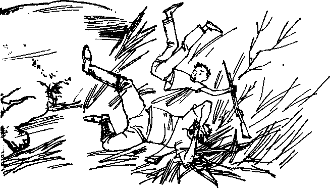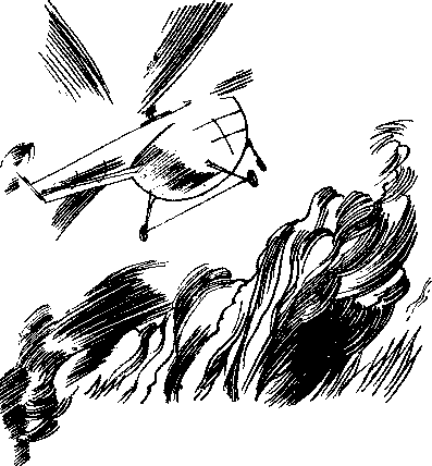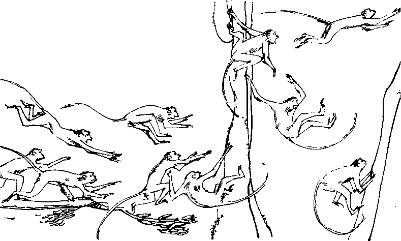 Наконец мы достигли просвета. Каген пролетел над ним и указал мне вниз: «Пикируй!»… Спорить было некогда. Я сложил крылья, взмахнул руками и ринулся в темневшую подо мною дыру… Сильный рывок за правую руку внезапно затормозил моё падение. И в ту же секунду я почувствовал, как какая-то тяжесть, повисшая на руке, увлекает меня вниз… Инстинктивно я расправил крылья. Хорошо, что ветви уже кончились и я не зацепился за них!.. Знаете, что я увидел, когда раскрыл глаза? Вокруг моего правого запястья был обмотан шарф, а на его конце болталась мартышка. На её груди висел крохотный серый детёныш… Каген со свистом пронёсся мимо меня и врезался в воду… Две лодки уже спешили ему на помощь.