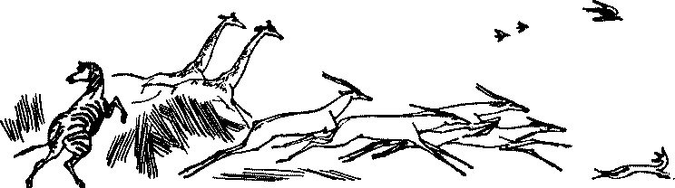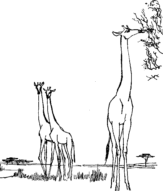 Темнота нисколько не мешала нам, а лунный свет, заливавший холмы, придавал всей картине совершенно необычный, прямо-таки фантастический вид… — Мальчики, — прошептала Нкале, — конечно, мы бы могли теперь вернуться и доложить, что задание выполнено. Но на рассвете вертолет унесёт нас отсюда… — Можешь не продолжать, — перебил я. — Спланируем и полетаем над ними. Высота — метров пятнадцать-двадцать… Каген молча кивнул. Видно было, что он что-то обдумывает. Затаив дыхание, стараясь не производить крыльями никакого шума, мы полетели над главным стадом… Антилопы составляют одну из самых больших групп отряда парнокопытных жвачных животных. Они водятся на всех континентах Земли, за исключением Австралии и, разумеется, Антарктиды. Но больше всего их в Африке. Тут есть даже такие маленькие, как например, дукеры — величиною с дворняжку, и такие крупные, как ориксы, куду, канны и гну — размером приблизительно с лошадь… Однако в нашем стаде таких крупных антилоп не было, а были только газели и прыгуны. Это небольшие, очень изящные животные… Газели имеют ровную окраску рыжевато-песчаного цвета; у прыгунов же шерсть глянцевая, темно-коричневая, с белой полосой вдоль спины. Передняя часть морды, уши и хвостик у прыгуна тоже белые. А рога длиннее и изогнуты более замысловато, чем у газели. Своё название эта антилопа получила за удивительно высокие и красивые прыжки, которые она, как бы играя, совершает во время бега… Ночь была довольно прохладная. Паря над стадом, мы чувствовали беспрерывный поток тёплого воздуха, восходящий от дыхания множества сгрудившихся: внизу животных. Некоторые из них паслись. Другие спали. Но даже во сне они продолжали двигать челюстями, пережёвывая съеденную днём траву. Эта особенность отличает всех жвачных животных, к которым, кроме антилоп, принадлежат также верблюды, жирафы, буйволы, олени, коровы, овцы и некоторые другие парнокопытные… Их сложный желудок может переварить самую грубую пищу, но для этого он время от времени должен выталкивать её обратно в рот, чтобы животное ещё пожевало и получше перемешало со слюной… Совершив большой круг над антилопами, мы пролетели над табуном зебр, чёрно-белые полосатые шкуры которых делали их чем-то похожими на собственные скелеты… Тут к нам присоединился Каген. — Сейчас вы увидите великолепный трюк! — с ходу объявил он. — Летим к жирафам!.. — Интересно, — сказал я. — Что ты придумал? — Трюк. Приготовься к съёмке! Жирафы обосновались на краю небольшой рощи зонтиковидных акаций, метрах в четырехстах от табуна зебр. На деревьях не было листьев — засуха оголила их ветви, но жирафы всё-таки выбрали это место, очевидно, по привычке. Самые высокие на земле животные, они предпочитают не подножный корм, а молодые побеги и зелёные листья деревьев. Но сейчас листьев не было, и горемыкам приходилось широко расставлять свои передние ноги и во всю длину вытягивать трёхметровую шею, чтобы пощипать траву. Когда они выпрямлялись, их маленькие головки с торчащими вверх ушами, между которыми смешно возвышалась пара покрытых шерстью рожек, оказывались на уровне самых высоких ветвей. Большие, окружённые длинными ресницами глаза печально оглядывали голые ветки в поисках хоть одного съедобного листика… Тонкая тень ветвей причудливой сетью ложилась на пятнистую, красновато-бурую шерсть этих 