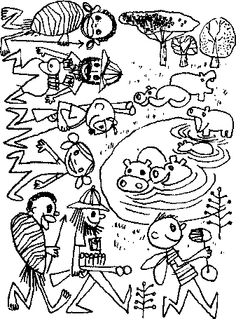— Смотри, — говорила Нкале мартышке, — смотри внимательно! Отсюда начинается твоя новая жизнь! Через какую-нибудь сотню лет ты и твой детёныш станете обитателями другой планеты. Гордись!.. В лагере нас встретили наши африканские друзья — охотники и ловцы зверей. Элиас Кимараре — начальник отряда, Эдодо, Чуи, Рукиди, Юма, Шимба и Секулету… С ними были их охотничьи собаки с деревянными колокольчиками на шеях, чтобы охотники могли знать, где они находятся, когда в погоне за зверем исчезают в зарослях. Дело в том, что настоящие африканские собаки почти никогда не лают… Но тут начался тропический ливень, и мы скрылись в своей палатке.