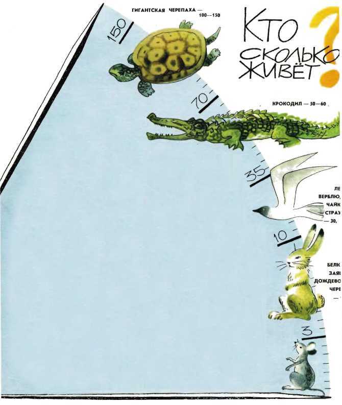 КТО СКОЛЬКО ЖИВЁТ? Гигантская черепаха — 100-150 Попугай, ворон — 70-140 Слон, гриф — 70-120 Гусь, карп, белуга, сокол, орёл, гигантская тридакна — 40-80 Гигантская саламандра — 70 Щука — 70-80 Крокодил — 50-60 Лебедь — 50 Павлин, медведь, кит, бегемот, носорог, бобр, тигр, осёл — 40-50 Горилла, шимпанзе, орангутанг, лошадь — 35-40 Лев, верблюд, чайка, страус — 30 Тюлень, уж, корова, курица, голубь — 20-30 Рысь, лось, олень, краб, рак, лягушка — 20 Летучая мышь, собака, кошка, канарейка, скворец, пиявка —15-20 Волк, лиса, овца, соболь, паук-птицеед — 10-15