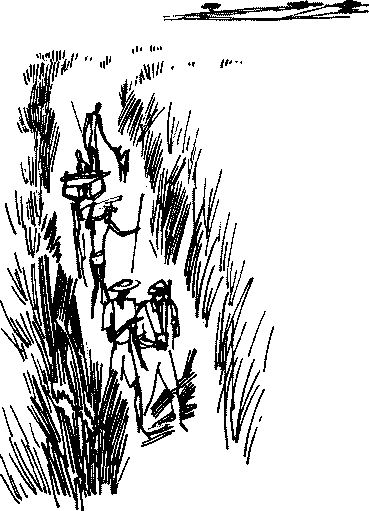 На рассвете следующего дня, выступая в поход на гору Бугаламиза, мы выглядели, прямо скажу, неважно. Сеггридж шутил, что в таком виде в гости не ходят, даже к гориллам. Меньше всех была изукрашена Нкале. Как только пчёлы начали жалить, она взлетела повыше, туда, где они её не трогали. Оттуда она командовала: — Смелее, мальчики! Если вы отступитесь, Касиула перестанет вас уважать! Кроме того, я люблю мёд. Он полезный и сладкий! Каген грозил ей кулаком. Говорить он не мог — от пчелиных укусов у него распухли губы. Впрочем, у меня тоже… Самым удивительным было то, что пчёлы совсем не жалили Касиулу. Даже, когда он взобрался на дерево и до самого плеча запустил свою голую руку в дупло с диким ульем, они почему-то атаковали не его, а нас! Спустившись с дерева, маленький охотник радостно протянул нам жёлтые душистые соты, полные густого золотистого мёда и белых личинок. Мы что-то промычали в ответ. Тут только он заметил наш вид. Как он был огорчен, вы бы видели!.. Жалобно вздыхая, он немедленно принялся смазывать нам лица, шеи и руки мёдом и, как это ни странно, пчёлы сразу же перестали нас жалить, а боль немного утихла… Когда мы отлетели на достаточно безопасное расстояние, Нкале присоединилась к нам. Счастливая улыбка, озарившая лицо Касиулы, при виде того, с каким удовольствием Нкале на лету уплетает добытый им мёд, заставила нас несколько примириться с личными неприятностями. Всю ночь нам делали примочки, ставили градусники и давали лекарства… А на рассвете мы пошли к гориллам. Покинув плантацию хинных деревьев и миновав окраину находившейся по-соседству банановой плантации, где под гигантскими, походящими на зелёные флаги листьями, с толстых стеблей свисали громадные жёлто-зелёные гроздья сладких, ароматных плодов, мы пересекли болото и начали подъём в гору. Каменистый склон был очень крутым. Размахивая тяжёлыми железными секачами, которые африканцы называют «мгусу», мы прорубались сквозь непроходимые заросли шиповника, папоротников, крапивы и бамбука, воевали с лианами, проползали под стволами упавших деревьев. С каждым шагом дорога делалась всё труднее. Ползучие растения путались у нас в ногах. Лёгкие магнитофоны, бесшумные ружья, кино и фотокамеры, которые мы несли с собой, постепенно становились всё тяжелее. Только пигмеи, казалось, нисколько не устали. Они специально замедляли шаг, чтобы мы не отставали от них, ловко проскальзывали между переплетённых лианами ветвей и, словно играя, преодолевали крутизну. Но они не играли. Всё их внимание было напряжено, лица выражали величайшую озабоченность. Иногда они вдруг останавливались и начинали совещаться между собой, рассматривая не видимые нами следы. После одной из таких остановок Касиула велел трём пигмеям перейти назад и занять место в хвосте отряда. — Они обнаружили следы горилл, — тихо объяснил нам Рам Чаран. — Теперь нужно быть начеку. Гориллы имеют дурную привычку — прятаться в зарослях, пропускать мимо себя отряд, а потом бесшумно бросаться на последнего. Когда их преследуют, они нередко уходят вперёд, пробираются окружным путём к своему следу и внезапно нападают на охотников сзади… Впрочем, этот коварный приём известен также слонам, буйволам и леопардам… Подъём продолжался уже более трёх часов. Лес начал постепенно редеть. Мы пересекли слоновью тропу, шедшую поперёк склона и 