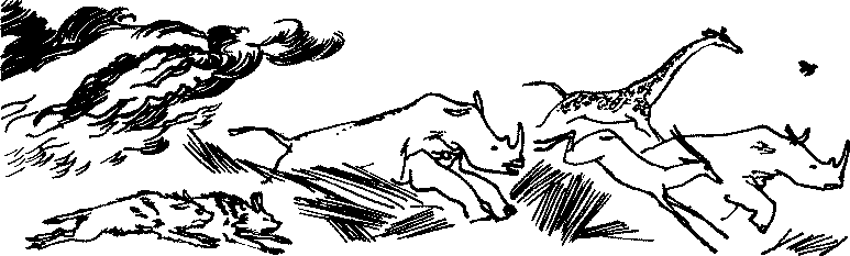 Я видел, как летучее пламя пронеслось над тушей вчерашнего носорога. Штук восемь грифов, отяжелевших от пищи до того, что уже не могли подняться в воздух, беспомощно хлопали крыльями. Они вспыхнули, словно факелы. Там, где проходил огонь, оставался дымящийся чёрный пепел и обгорелые тела замешкавшихся животных…