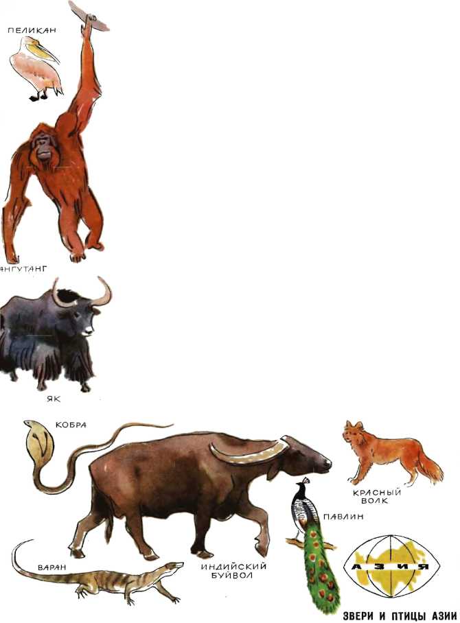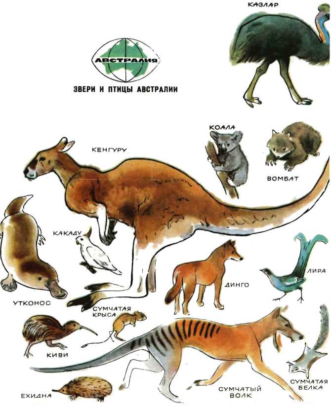 52. Когда европейцы начали изучать животных Австралии, оттуда вдруг пришло поразительное сообщение: будто бы по берегам рек и ручьёв там живёт странное существо — нос у него утиный, только ещё шире, между пальцами передних и задних лап плавательные перепонки, всё тело и хвост покрыты шерстью, а самое главное, вместо того чтобы рожать детёнышей, как другие звери, это существо несёт яйца, но вылупившихся из них детенышей кормит… собственным молоком. Сообщение было совершенно невероятное, и ему несколько лет никто не хотел верить. Однако пришлось!.. Чудное животное действительно существовало. Учёные назвали его утконосом. Только потом очень долго не могли решить, кто же это: млекопитающее, рептилия или птица. Ну, в конце концов, установили, что это всё-таки самое настоящее млекопитающее. Именно так размножались первые млекопитающие приблизительно 100 миллионов лет назад, когда начали происходить от рептилий. 53. С Австралией вообще получилось не так, как с другими материками. Вместе с прилежащими к ней островами — Новой Гвинеей, Тасманией и Новой Зеландией — она первая отделилась океаном от всей остальной суши. Произошло это около ста миллионов лет назад, когда многие млекопитающие ещё сохраняли некоторые особенности своих предков — рептилий. Одни из них ещё несли яйца, высиживали и выкармливали детёнышей молоком, как утконос. Другие хотя и рождали живых детёнышей, но таких недоразвитых, что отдельно от матери им жизни не было. Поэтому, когда такой детёныш появлялся на свет, мать закладывала его в специальную сумку на своём животе. Там он жил — посасывал молоко, спал и продолжал развиваться, пока не становился самостоятельным. Этих животных называют сумчатыми… И вот получилось так, что другие млекопитающие в Австралию не попали — только яйцекладущие и сумчатые. И потому она оказалась настоящим музеем живых ископаемых! Кроме утконоса, там живёт ещё другое необыкновенное существо — ехидна. Тело ее покрыто колючками, между которых пробивается шерсть. Когда ехидна сносит яйцо, она не высиживает его в гнезде, как это делает утконос, а сразу кладёт в сумку у себя на боку и там выгревает. Детёныш вылупляется уже в сумке и не вылезает из неё, пока как следует не оформится. Так что ехидна — это уже переход к сумчатым животным… Все остальные австралийские животные — настоящие сумчатые. Из них на первом месте, конечно, кенгуру. Кенгуру бывают и такие маленькие, как кролик, и очень большие — величиной чуть не с корову. Некоторые кенгуру живут на деревьях, как обезьяны, а самые большие обитают в саваннах и могут совершать прыжки в 10 метров длиной. Такие у них могучие задние ноги и хвост, которым они тоже отталкиваются от земли… Очень смешной и ласковый маленький сумчатый медведь — коала, который, хотя и взрослый, похож на игрушечного медвежонка. Коала живёт на деревьях. Пища его — зелёные листья эвкалиптов. После того, как детёныш коала вылез из сумки, мама долго ещё не расстаётся с ним, а носит на спине, как маленький пушистый рюкзачок с круглыми глазками и большими ушками… Есть в Австралии и другие сумчатые звери — сумчатые волки, сумчатые муравьеды, сумчатые белки, кроты и мыши и, похожие на барсуков, вомбаты… А если там попадается какой-нибудь обыкновенный, несумчатый зверь, значит, у него другое происхождение. Например, одичавшую собаку дин