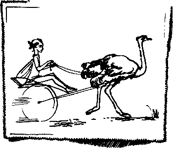 Вертолёт шёл на запад. Позади остались бескрайние просторы опалённого солнцем плато Серенгети, сверкающая гладь огромного озера Виктория, изумрудно-зелёные леса Руанды… Дважды мы приземлялись, чтобы пополнить запас горючего. Первая посадка была на ферме, где разводили страусов. Курчавые, лёгкие, как дым, хвостовые перья этих нелетающих быстроногих птиц очень ценятся за красоту… Мне давно хотелось проверить, действительно ли, как нам говорили, когда страусу угрожает опасность, он закрывает глаза и зарывается головой в песок, воображая, что враг его не увидит. К сожалению, мои личные наблюдения этого не подтвердили. Наоборот, я убедился лишь в том, что, когда страусы не хотят иметь с вами дела, они просто убегают… Или могут повернуться к вам спиной и лягнуть, как лошадь… Между прочим, на ногах у них всего по два пальца!.. Я подтолкнул Кагена локтем в бок и спросил, нет ли у него желания прокатиться верхом на страусе? Могу снять… Но у него почему-то такого желания не было. Зато Нкале охотно приняла предложение хозяина фермы проехаться на беговых дрожках, в которые была запряжена прирученная птица. Вот фото. На прощанье фермер подарил нам двух страусят и десяток громадных яиц, чтобы мы могли вывести в инкубаторе страусовых птенцов на своей планете…