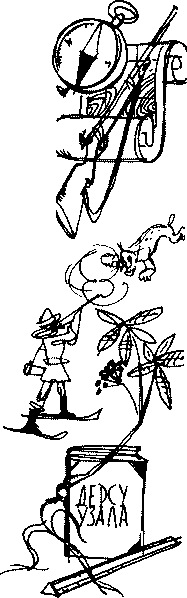 Посмотрите на карту, найдите Африку. Словно гигантская пистолетная кобура, красуется она на поясе у земного шара. Пояс этот — экватор. Лишь северный и южный края континента немного выступают за пунктирные линии тропиков. Такое расположение оказалось очень удачным: за последние двести миллионов лет Африка ни разу не подвергалась оледенениям. Другие континенты подвергались, а она нет. На других континентах резко менялся климат, а с ним и условия жизни. Одни животные и растения из-за этого погибали другие приспосабливались к переменам и менялись сами. А в Африке резких перемен не было. Вот почему некоторые африканские животные и растения остаются похожими на своих далёких предков… В Африке мы сначала должны были познакомиться с фауной и флорой её тропических лесов — джунглей и примыкающих к ним саванн. А затем, посетив одну из простирающихся за саваннами пустынь, мы намечали совершить путешествие по другим континентам планеты… На нашей маршрутной карте разными красками были обозначены главные климатические зоны Земли с характерными для них животными и растениями. Условные знаки отмечали месторасположение отрядов «КИС-КИС», в работе которых мы собирались принять участие. Но всё это было ещё впереди. А сейчас мы сидели в нашей палатке и готовились к завтрашней охоте. Наступали сумерки. Тропический ливень шёл к концу, шум его постепенно ослабевал. В палатке было светло и сухо. Ярко горела электрическая лампочка. На походной газовой плитке пеклись покрытые коричневой кожурой, разрубленные на куски бататы. Этот тропический корнеплод имеет сладковатый вкус и заменяет африканцам картофель. В его желтоватой мякоти много крахмала и сахара. Каждый из нас был занят своим делом. Каген настраивал рацию. Сеггридж делил своё внимание между приготовлением ужина и сервировкой стола. Последнее он делал как-то особенно тщательно — постелил чистую скатерть, а посредине водрузил вазу с цветами. Видно было, что он что-то затевает, но что именно, он пока не сообщал. Академиков был занят киноаппаратурой. Я записывал в путевой журнал происшествия минувшего дня. А Нкале и Рам Чаран набивали патронташи зарядами для наших дальнобойных бесшумных ружей, стреляющих не пулями, а специальными ампулами с усыпляющей жидкостью. Эти ампулы оканчивались острым жалом — тонкой полой иглой, как у шприца. Через жало снотворное проникало под кожу раненого животного. Никакой боли животное при этом не ощущало, только лёгкий укол, как от укуса комара или москита. К этим зарядам следовало относиться с большим вниманием — ведь доза снотворного, предназначенная для того, чтобы усыпить взрослого слона, наверняка была бы смертельной для его слонёнка. Или ещё хуже — допустим, что впопыхах вы пальнули кабаньим зарядом по носорогу… Он же и не подумает заснуть! И если заметит вас — не спасётесь!.. — Расчёт снотворного, — объяснял Рам Чаран, — производится на один килограмм веса животного. Если вес животного не превышает двадцати кило, оно должно уснуть от единичной дозы. Эти заряды выкрашены в белый цвет. Для животных, весящих от двадцати до пятидесяти килограммов, заряды жёлтого цвета. От пятидесяти до ста — голубые. Полтонны — зеленые. Тонна — чёрные. И, наконец, для самых крупных животных, например, для слонов, вес которых достигает нескольких тонн, предназначаются за
