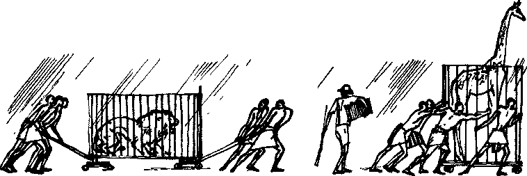 Клетку с надписью «Трубкозуб» занимало большое, незнакомое мне существо, под которым копошилось два маленьких розовых сосунка… Как бы вам его описать? Ну, представьте себе, что кто-нибудь взял свинью и начал тянуть за рыло. И вытянул бы в длину приблизительно на полметра. При этом вокруг пятачка во все стороны наросли бы щетинки, и пятачок стал похожим на одуванчик… Уши свиные, но длинные — не меньше ослиных. На сильных неуклюжих ногах — огромные когти. Только не спрятанные, как у хищников — например у львов или леопардов, а выставленные наружу, как на ковшах канавокопателя… Покрытое рыже-бурой щетиной туловище заканчивалось полуметровым толстым хвостом… — На руках нам это семейство не донести, — сказал Рам Чаран. — Придётся сходить за тележкой… Он отправился за тележкой, а удивительный трубкозуб, громко стуча когтями по деревянному настилу, приблизился к решётке и просунул наружу свой «одуванчик». Он посмотрел на меня, и из его узкого рта начал выползать длинный-предлинный червь! Я попятился… Ну да, первое, о чём я подумал, что в животном поселилась змея! Но червь был тонкий, розовый и не имел головки… Аскарида?.. Воображаю, как бы смеялся Сеггридж, поделись я с ним своим открытием! А Рам Чаран даже не улыбнулся. — Это не глист, Тькави, — сказал он совершенно серьёзно. — Это язык… Самый обыкновенный язык, который необходим трубкозубу, чтобы добывать муравьёв и термитов из их подземных жилищ… Мы погрузили клетку и покатили к барже. Раскаты грома, шум дождя и стекающие в рот капли мешали вести разговор, но всё же Рам Чаран рассказал мне кое-что о наших пассажирах. Трубкозубы, как объяснил он, водятся только в Южной Африке и на острове Мадагаскар. Они живут в норах и, благодаря своим огромным когтям, могут с поразительной быстротой целиком зарываться в самую твёрдую землю. На это им требуется всего несколько минут. Когтями же они разгребают муравейники и ломают крепкие, как бетон, стены термитников. Потом в дело пускается проворный, липкий язык. Он глубоко проникает в извилистые подземные ходы, и насекомые прилипают к нему, как мухи к липучке. Через секунду они уже оказываются в желудке трубкозуба, а удивительный язык снова отправляется на охоту… Мы миновали Сеггриджа и Кагена, которые тащили к барже двух маленьких брыкливых зебр. Зебры упирались. Обляпанный грязью с головы до ног Каген пытался растолковать им, что если они останутся на берегу, то обязательно утонут… Зебры его не слушали…