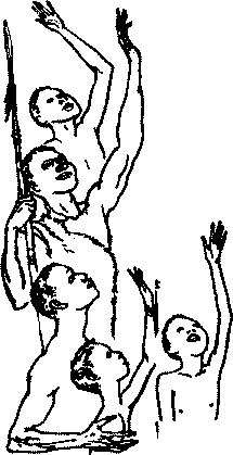 — Далеко! — с отчаяньем воскликнул я. — Нам не догнать!.. — Летим наперерез!.. Нкале придерживается реки, а река делает поворот и снова приближается к нам, вон там… Видишь? Мы устремились к намеченному месту, обсуждая на лету план действий. Наши крылатые тени скользили по изумрудной поверхности тропического леса, как тени самолётов или птиц скользят по кустарникам и траве на поверхности земли. — Не понимаю одного, — сказал Каген, — почему она летит так низко? Почти у самых верхушек. — Ищет просвет, — догадался я. — Тут будут решать секунды. Если она опоздает хоть на мгновенье, обезьяны блокируют отверстие и тогда — всё пропало. — Обезьян я беру на себя, — решительно объявил Каген. Теперь Нкале тоже заметила нас. Расстояние между нами быстро сокращалось. Я уже мог рассмотреть её задорный, облупившийся от солнца нос, азартный блеск в разгорячённых погоней глазах, капли пота на лбу. Волосы её перепутались, шарфа, который Нкале обычно носила на шее, не было. — Давай вверх! — жестом показал я Нкале, не надеясь перекричать обезьян. Каген отважно бросился вперёд, чуть ли не в объятия передовому отряду преследователей. В следующий момент он уже вёл их за собой, в сторону от реки. Я поднялся повыше, и Нкале присоединилась ко мне. — Не думай, что я испугалась, — первым делом заявила она. — Я и не думаю. Испугались все остальные. Как тебя угораздило? — Погналась за бабочкой. А она вверх. Я за ней. А потом эти мартышки. И я уже не могла обратно… Они очень смешные, правда? Всматриваясь в переплетение ветвей, мы летели вдоль изгибов реки, стараясь не пропустить просвет. Нам годился даже самый маленький, лишь бы он где-нибудь был. Вопли гнавшихся за Кагеном обезьян раздавались то сбоку, то впереди, то сзади нас — в зависимости от того, в какую сторону поворачивала река. — Жаль, у него нет сачка, — сказала Нкале. — Когда их дразнишь, они орут ещё веселее… Я молча протянул руку за её сачком. Наверно, она подумала, что я хочу передать его Кагену. Но я хотел отметить просвет. Он зиял прямо под нами в чаще ветвей и листьев, словно отверстие чёрного, уходящего в глубину колодца. — Теперь я сама… — Нкале умоляюще посмотрела на меня. — Ладно? — С условием, — сказал я, — если лодок там нет, не вздумай никуда лететь. Жди нас. Быстро прикрепив сачок к самой высокой ветке на краю просвета так, чтобы его можно было легко заметить издалека, я полетел к Кагену. Мартышки бесновались, как одурелые. Их было, наверно, не меньше сотни, и каждая старалась перекричать всех остальных. Маленькие, почти человеческие лица обезьян, были искажены яростью. Чёрные глазки злобно сверкали из-под нависших над ними надбровных дуг, а большие жёлтые зубы скалились так, что мороз подирал по коже. С удивительным проворством мартышки переносились с дерева на дерево, одинаково ловко цепляясь за ветви руками, ногами и хвостом. Земные учёные были совершенно правы, назвав обезьяний хвост «пятой хватательной конечностью». Так это и было на самом деле. И, могу сказать, если бы эти существа имели крылья, а тела их не покрывала замечательно красивая шерсть с зеленоватым отливом на спине и серебристо-серая спереди, они походили бы на нас даже больше, чем земные люди… Вполне возможно, что мартышки приняли нас за своих ближайших родственников и только поэтому затеяли всю кутерьму. Может быть, они просто боялись, 