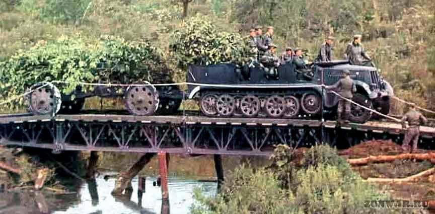 Второй ингредиент — сами по себе моторизированные соединения. Трудно уязвимые для пехоты танки, при поддержке самоходных орудий и доставленная на грузовиках мотопехота (панцергренадеры, по терминологии вермахта). Впереди идет нечувствительная к пулеметнооружейному огню и осколкам от артиллерийского обстрела бронегруппа с пехотой в броневиках. Бронегруппа бывала самого разного состава, но всегда подвижная и мощная, нацеленная не столько на штурм, сколько на поиск уязвимых мест в обороне врага. Нельзя везде поставить противотанковые пушки. Да даже если и окажется вся противотанковая артиллерия советской стрелковой дивизии (12 «сорокопяток» по штату 1939-го года) на направлении главного удара бронированного кулака, то что? Благодаря скоростным тягачам с артиллерией, не отстающих от танков, авиации и пехоте моторизированные части вермахта, и уж тем более танковые дивизии, попросту нивелируют такое препятствие. Сравняют до уровня земли, если говорить прямо. И это и будет третий ингредиент — артиллерия. Мощный артиллерийский кулак танковой дивизии, способный не отставать от танков и мотопехоты при стремительных бросках вперед. Артиллерия это именно то, что всегда отстает, вместе с остальными тылами. Но только не в случае танковых дивизий вермахта. Чтобы успевать артиллерией за танками, у вермахта были скоростные тягачи.