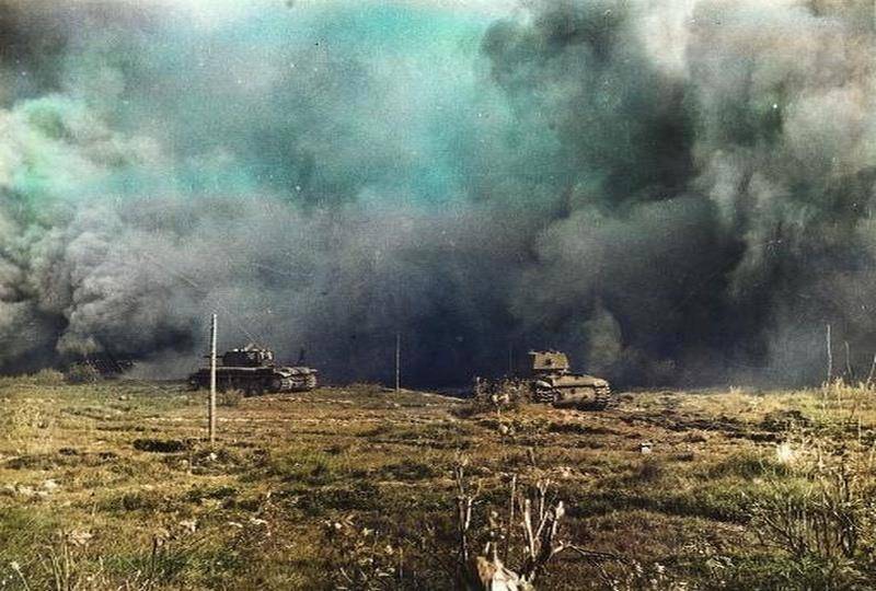 Перед наступающими порядками 6-й танковой, как это обычно и случалось, горело. Горело почти все. Огонь — обязательный спутник войны. И в той войне у него было много еды. Горели хаты, сараи, стоги сена, остатки небольшой рощи. И разбитая немецкая техника. Каждый горящий танк, будто бы лил в верх густой столб дыма, словно заполняя огромную синюю чашу над головой людей черной, едкой водой. И по небу, над полем боя, расползалось темное пятно, делая солнце маленьким и тусклым.