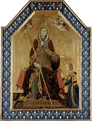 Роберт Мудрый (стоит на коленях) коронуемый своим старшим братом, Людовиком Святым — знаменитая сцена, которая так и не состоялась, поскольку Людовик умер в 1297 году, за двенадцать лет до того, как Роберт был коронован Климентом V. (Работа Симоне Мартини (1284–1344). Museo di Capodimonte, Naples, Italy).