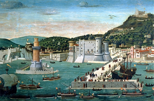 Вид Неаполя в Средние века, включая Кастель-дель-Ово на берегу залива и Кастель-Сант-Эльмо на холме. (Certosa di S. Martino, Naples, Italy).