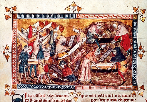 Захоронение жертв чумы в Турне, 1349 год, из анналов Жиля де Муизита, аббат Сен-Мартен, 1352. (MS 13076-7, c.24t, Fol. 24v., Bibliotheque Royale Albert I, Brussels, Belgium).