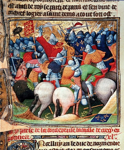 Сцена битвы при Креси, 1346 год, из книги Les Chroniques de France. (Cotton Nero E. II, fol. 152v (detail), British Library, London, Great Britain).