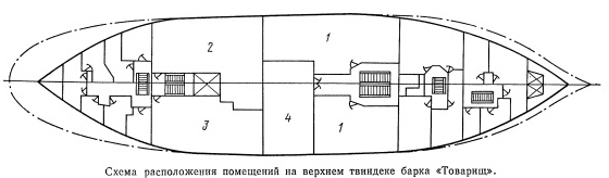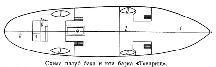 Схема палуб бака и юта барка «Товарищ»: 1 — палуба бака; 2— ростры; 3—спасательные шлюпки; 4 — световой люк машинного отделения, 5—палуба юта; 6—штурманская рубка, 7 —радиорубка