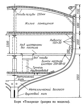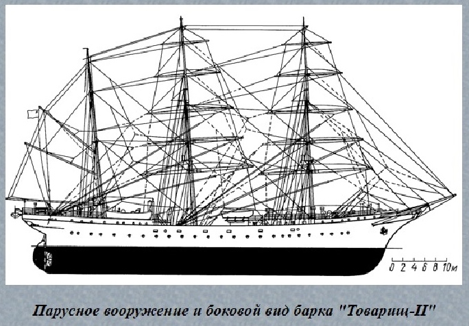 Новый парусник «Товарищ» по своему парусному вооружению — барк, т. е. трехмачтовое судно, у которого на первых двух мачтах имеются реи и прямые паруса, а на третьей мачте паруса косые. Это учебное судно, поэтому из 176 членов экипажа 134 — практиканты. Наибольшая, длина судна вместе с бушпритом 73,6 м, а длина по ватерлинии 62,0 М. Ширина корпуса 12,0 м, высота борта от киля до верхней палубы 7,3 м. Осадка (без киля) 4,6 м, а с килем 4,85 м. Корпус судна стальной, с баком и ютом. Мачты и реи (кроме двух самых верхних) тоже стальные. На судне всего 25 парусов общей площадью около 1800 кв. м. Топ самой высокой мачты возвышается над водой на 42 м.