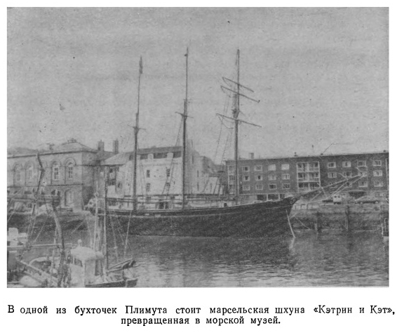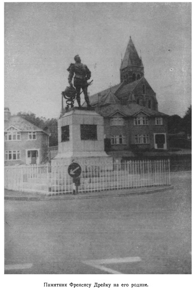 Во время стоянки в Плимуте нам пришлось встречать Первомай. В этот день на «Товарище» состоялась церемония торжественного подъема Государственного флага. Во второй половине дня для участников регаты Парусная ассоциация организовала автобусную экскурсию по окрестностям Плимута. Она оказалась неожиданным приятным дополнением к нашему празднику. Впервые мне, да и моим товарищам, пришлось ехать в двухэтажном автобусе. Все, конечно, старались забраться на второй этаж, который имеет неоспоримые преимущества для туристов, благо места можно было выбирать по своему вкусу. Очень непривычно принятое в Англии левостороннее движение: все время кажется, что водитель нарушил правила, и мы вот-вот с кем-нибудь столкнемся. В роли пешехода тоже испытываешь на английских улицах чувство неуверенности. Твердо усвоенное правило: переходя улицу — посмотри налево, а дойдя до её середины — направо, нам явно мешало. Не задумываясь, автоматически, мы смотрели налево, вступая на проезжую часть, и тут же раздавался справа визг тормозов. Водители резко затормозивших машин вежливо молчали, но это можно было объяснить только английской сдержанностью. Левостороннее движение — отголосок времен гужевого транспорта: кучер, двигаясь по левой стороне улицы и держа кнут в правой руке, не задевал им прохожего на тротуаре. Кроме того, садясь на лошадь верхом, всадник сначала вставлял в стремя левую ногу, а это удобнее делать, если лошадь стоит на левой стороне улицы, т. е. если голова ее «смотрит» в сторону предстоящего движения. Времена эти давно прошли, но традиция есть традиция! Во время поездки мы посетили родину Френсиса Дрейка — небольшой городок Тависток, расположенный в округе Крондейл. Сам Тависток интереса не представляет. Единственными его достопримечательностями являются памятник Дрейку, копия памятника в Плимуте, и очень живописный средневековый собор, весь увитый плющом. Экскурсия всем понравилась — она позволила посмотреть на Англию, так сказать, изнутри: увидеть поля, пустоши, все то, что обычно недоступно во время кратковременных стоянок.