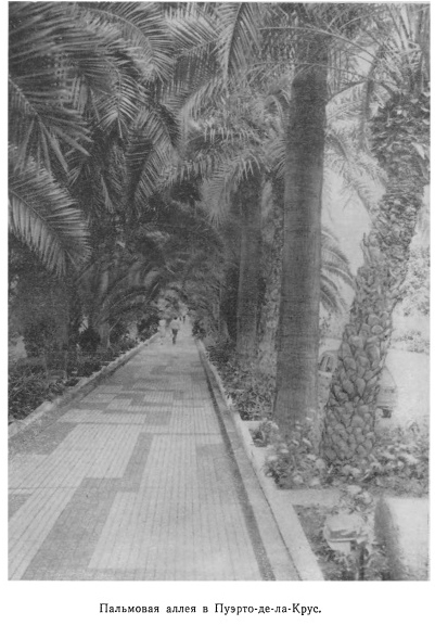 Следующую остановку мы сделали в прибрежном городке Пуэрто-де-ла-Крус. Если на острове 20% населения занято в промышленности, 40%—в сельском хозяйстве, и 40% обслуживает туристов, то в Пуэрто-де-ла-Крус все население занято сегодня обслуживанием примерно 50000 туристов. Некогда небольшой рыбацкий поселок сейчас стал наиболее важным туристическим центром Канарских островов, своего рода мировой знаменитостью. Центр и прибрежная часть города полностью застроены дорогими отелями, магазинами и увеселительными заведениями. Вдоль шеренги многоэтажных современных зданий — живописная пальмовая аллея, вымощенная мраморными плитками. Берег здесь скалистый и неудобный для купания. Есть только один небольшой пляж, покрытый черным песком, да и тот полупустой: на нем купаются только' местные мальчишки, так как в открытом океане купаться, не принято. Для этой цели во всех отелях предусмотрены плавательные бассейны с морской и пресной водой. Подавляющее большинство туристов приезжает отдыхать на Канарские острова по путевкам, стоимость которых значительна и колеблется в широких пределах в зависимости от уровня комфорта и сезона. Самые дорогие путевки зимой. Только очень состоятельные люди могут позволить себе приехать без путевки или, говоря по-нашему, «дикарем». Такой отдых обходится значительно дороже, но считается более приятным. Это была у нас последняя остановка, и по отличной автостраде, рассчитанной на движение со скоростью до 130 км/ч, через 30 минут мы уже въезжали в Пуэрто-де-ла-Крус.