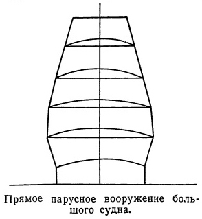 Бом-кливер 46,З Кливер 45,2 Средний кливер 49,0 Фор-стень-стаксель 33,4 Фок 147,0 Фор-марсель нижний 90,5 Фор-марсель верхний 94,4 Фор-брамсель нижний 93,8 Фор-брамсель верхний 65,1 Грот 164,0 Грот-марсель нижний 90,5 Грот-марсель верхний 94,4 Грот-брамсель нижний 93,8 Грот-брамсель верхний 65,1 Бизань нижний 113,6 Бизань верхний 63,7 Бизань-граф-топсель 72,5Очень важным для парусника является и правильное расположение по высоте и длине центра парусности. От его положения по высоте зависят кренящие моменты от ветра, т. е. вероятность опрокидывания судна, а от положения по длине зависит управляемость. Рекомендуется, чтобы возвышение центра парусности над центром подводной части диаметральной плоскости для небольших судов составляло от 1,4 до 1,7, а для крупных — от 1,5 до 2,0 ширины судна. На нашем барке центр парусности возвышается над нижней кромкой киля на 24,36 м, а от центра подводной части диаметральной плоскости приблизительно на 22 м. Значит возвышение составляет 1,8 ширины судна. Кроме того, центр парусности должен находиться на 0,01 — 0,02 длины ватерлинии ближе к носу, чем центр подводной части диаметральной плоскости. На паруснике «Товарищ» центр парусности располагается при положении парусов в дрейфе на 0,03 длины ватерлинии, а при других вариантах постановки парусов — на 0,06 и даже 0,07. Благодаря этому судно хорошо управляется при попутных ветрах.