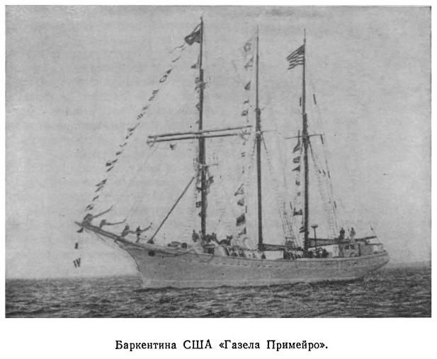 На рейде Нью-Йорка мы увидели итальянский трехмачтовый корабль военно-морского флота, носящий имя знаменитого флорентийского мореплавателя Америго Веспуччи. Корабль вступил в строй в 1931 г. и с тех пор дважды проходил модернизацию: в 1951 и 1958 гг. Это очень внушительное судно с черным высокобортным корпусом, вдоль которого тянутся две белые полосы. Длина корабля 101,4 м, ширина 15,5 м, осадка 6,6 м, водоизмещение 4146 т, площадь парусов 2100 кв. м. Ходок он, видимо, неважный и на регатах присутствует только как гость. Снова вокруг нас вращается беспрерывный хоровод разнокалиберных «посудин», битком набитых зрителями. Отношение американцев к советским морякам было явно дружественное, и, мне кажется, интерес наши суда вызывали больший, чем парусники других стран. Буквально все местные жители откликнулись на приход участников Операции Парус: покупали посвященные регате сувениры, посещали суда, без устали их фотографировали и т. п. Были и более оригинальные проявления внимания к Операции Парус-76: рулевой на одном из подходивших к нам буксиров, угрюмый парень с атлетической фигурой и мрачным лицом выразил, например, свое отношение к регате тем, что постригся наголо, оставив на темени часть волос в виде цифры 76. Телевидение подробно и регулярно освещало ход регаты. Смотрели телевизионные передачи и мы, хотя это занятие оказалось для нас очень тяжелым: каждые 10—15 минут фильм прерывается на 3—4 минуты для показа торговой рекламы. В результате вы узнаете, к примеру, о новых средствах мойки машины, а общего впечатления о картине не получаете. Перерывы для рекламы делаются обычно в самых интригующих местах фильма. Впечатление такое, что тебе периодически насильно разжимают зубы и кормят борщом в то время, когда ты ешь мороженое. 200-летие провозглашения независимости американских колоний от Великобритании и образования США приходится на 4 июля. На этот же день был намечен парад парусных судов, которому отводилась в праздничной программе главная роль. Он проводился в присутствии президента страны Джеральда Форда и дипломатического корпуса, аккредитованного в Америке. К параду мы готовились с подъемом еще и потому, что именно 4 июля в Советском Союзе впервые отмечался День работников морского и речного транспорта. В 10 ч к нам на борт поднялся лоцман, но случилось непредвиденное. Дело в том, что при постановке на якорь место его отдачи по рекомендации лоцмана обозначили буйком. По-видимому, в результате действия переменных течений трос, на котором крепился буек, запутался вокруг якорной цепи. Обнаружилось это только при съемке с якоря. Мимо «Товарища» проходила колонна парусников, идущих на парад, приближался момент, когда и мы должны были занять свое место в строю, а свернувшийся в клубок трос зажал якорную цепь, не позволяя якорю подняться до клюза. С большим трудом удалось все-таки втянуть его на место, а окончательно якорную цепь освободили от троса уже потом. Пришлось изрядно понервничать, но все обошлось благополучно. В И ч американский барк «Игл» открыл парад. «Товарищ» шел в колонне парусников четырнадцатым. Впереди нас — «Мирча», позади — «Крузенштерн». Замыкал парадную колонну американский парусник «Газела Примейро», успевший сделать ремонт после столкновения на Бермудах. На время торжественного церемониала прохождения члены экипажей пару