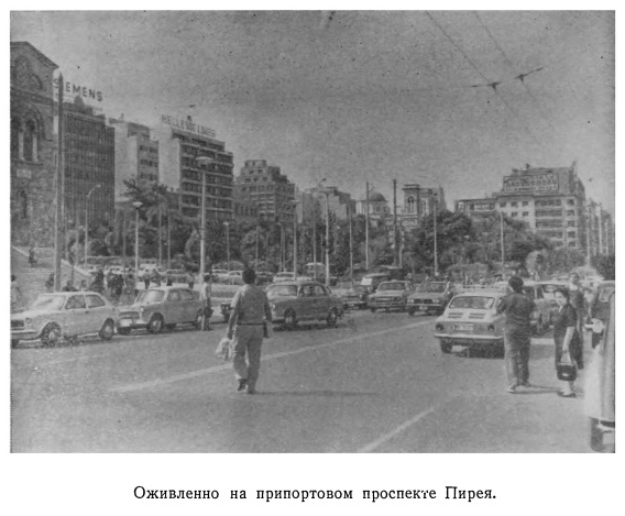 «Товарищ» ночевал на рейде, и весь вечер любители развлекались на юте ловлей рыбы на свет спущенной за борт люстры. Добыча не ахти какая, но для рыбака сам процесс ловли не менее интересен, чем результат. Неудовлетворенные вечерним ловом судовые рыбаки взялись за снасти на следующий день спозаранку, но их занятие прервал поднявшийся на борт уже в 7 ч лоцман, который провел нас в порт. Порт Пирей состоит из трех гаваней: Пролемин, Кендрикос и Алион. «Товарищ» поставили в средней, Кендрикос, кормой в угол между двумя причалами. В таком положении «Товарищ» занимал минимальное место, очень дефицитное в порту, и мы могли стоять сколько угодно. Связь с берегом наладили при помощи импровизированной паромной переправы, для которой приспособили судовую шлюпку. Пирей — порт Афин, столицы Греции, сросшийся с ней в единое целое. Границу между этими городами нелегко обнаружить неопытным глазом ни с моря, ни с суши, хотя по справочникам расстояние между ними 8 км. Автобусы и метро делают этот путь недолгим. На улицах Пирея, особенно в припортовом районе, шумно и многолюдно. Туристические суда под разными флагами швартуются иногда в самом центре города.