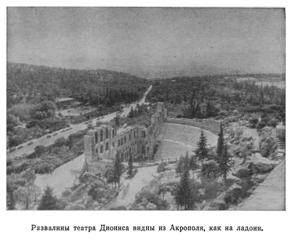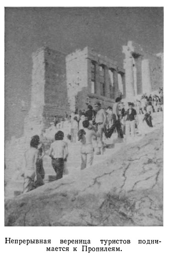 Пирей существовал уже в V в. до н. э. И здесь много интересных памятников, хотя цель нашего захода, конечно, Афины. Все вопросы, связанные с поездкой в Афины, решились быстро и просто благодаря помощи советских представителей, и в первый же день стоянки мы совершили автобусную экскурсию по городу. Сначала мы осмотрели современные Афины: беломраморный олимпийский стадион, дом премьер-министра, университет, академию наук, здание парламента. Не миновали непременный объект внимания всех туристов — королевский дворец. Короля в Греции уже давно нет, но его дворец по-прежнему охраняется часовыми. Замысловатая церемония смены часовых, с пританцовыванием и притоптыванием, рассчитана на зрителей, так же как и сами часовые несуществующего короля. Побывали и около памятника Байрону. Поэт, воспевший эту страну и нашедший в ней свою смерть, изображен вместе с молодой прекрасной женщиной, символизирующей Грецию. Недалеко от памятника видны ворота древних Афин. Еще несколько минут езды — и мы достигли своей основной цели — Акрополя. Акрополь по древнегречески означает «верхний город». Действительно, он расположен на холме с плоской вершиной, господствующей над окрестностями и в свое время являвшейся внутренней цитаделью города. У подножия холма — автостоянка. Отсюда по каменным ступеням пестрая разноязыкая толпа туристов из всех, стран мира поднимается к Пропилеям — входу в Акрополь.