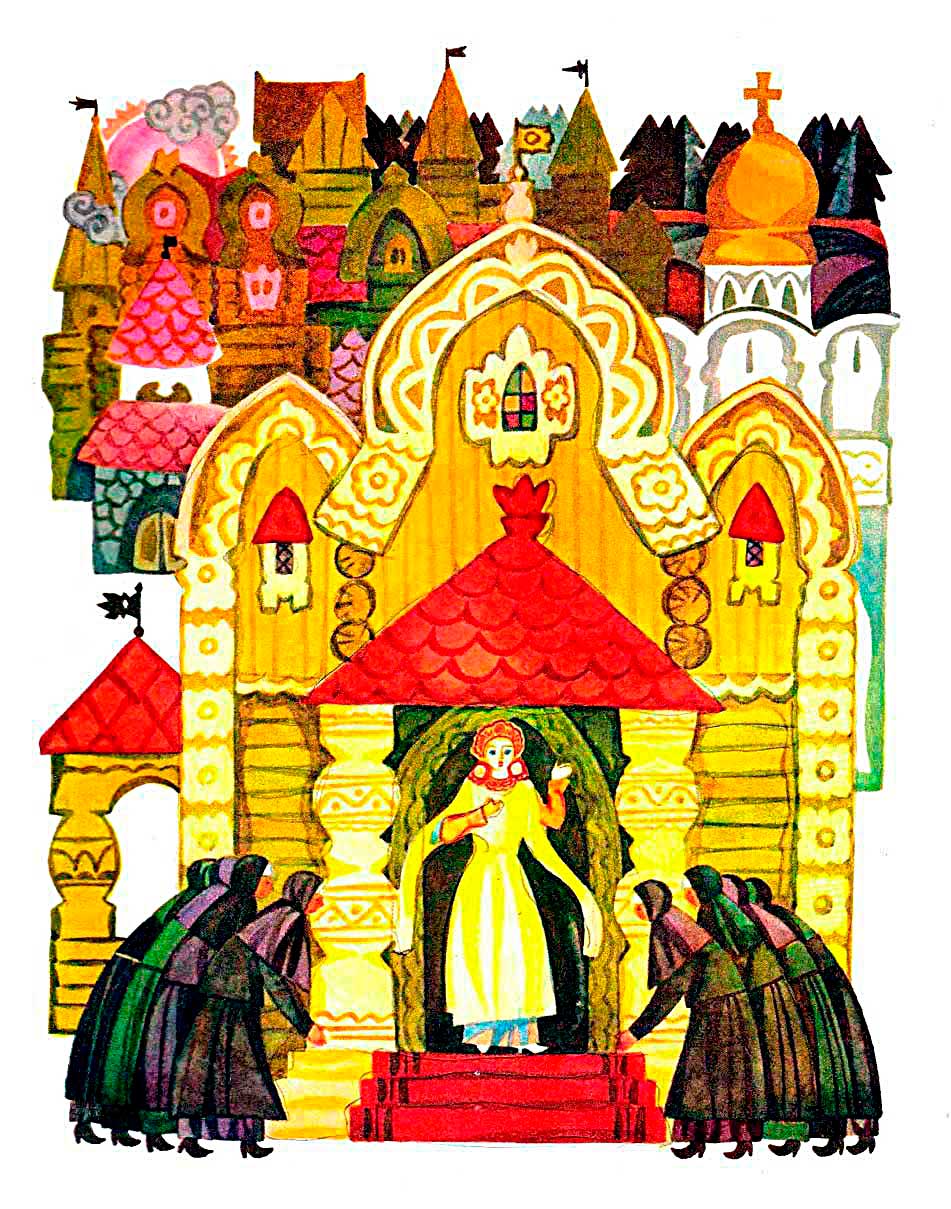 ⠀⠀ ⠀⠀ ⠀⠀ Вдруг поднялся стук да гром, весь дворец затрясся. Гости напугались, повскакали с мест, а Иван-царевич говорит: — Не бойтесь, честные гости: это моя лягушонка в коробчонке приехала. Подлетела к царскому крыльцу золочёная карета о шести белых лошадях, и выходит оттуда Василиса Премудрая: на лазоревом платье — частые звёзды, на голове — месяц ясный, такая красавица — ни вздумать, ни взгадать, только в сказке сказать. Берёт она Ивана-царевича за руку и ведёт за столы дубовые, за скатерти браные. ⠀⠀ ⠀⠀ ⠀⠀