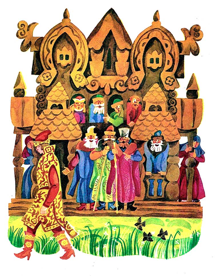 ⠀⠀ ⠀⠀ ⠀⠀ А те невестки сперва-то смеялись над лягушкой, а теперь послали одну бабушку-задворенку посмотреть, как лягушка будет печь хлеб. Лягушка хитра, она это смекнула. Замесила квашню, печь сверху разломала да прямо туда, в дыру, всю квашню и опрокинула. Бабушка-задво-ренка прибежала к царским невесткам, всё рассказала, и те так же стали делать. А лягушка прыгнула на крыльцо, обернулась Василисой Премудрой, ударила в ладоши: — Мамки, няньки, собирайтесь, снаряжайтесь! Испеките мне к утру мягкий белый хлеб, какой я у моего родного батюшки ела. Иван-царевич утром проснулся, а уж на столе лежит хлеб, изукрашен разными хитростями: по бокам узоры печатные, сверху города с заставами. Иван-царевич обрадовался, завернул хлеб в ширинку[2], понёс к отцу. А царь в то время принимал хлебы от больших сыновей. Их жёны поспускали тесто в печь, как им бабушка-задворенка сказала, и вышла у них одна горелая грязь. Царь принял хлеб от старшего сына, посмотрел и отослал в людскую. Принял от среднего и туда же отослал. А как подал хлеб Иван-царевич, царь сказал: — Вот это хлеб, только в праздник его есть. И приказал царь трём своим сыновьям, чтобы завтра явились к нему на пир вместе с жёнами. Опять воротился Иван-царевич домой невесел, ниже плеч голову повесил. ⠀⠀ ⠀⠀ ⠀⠀