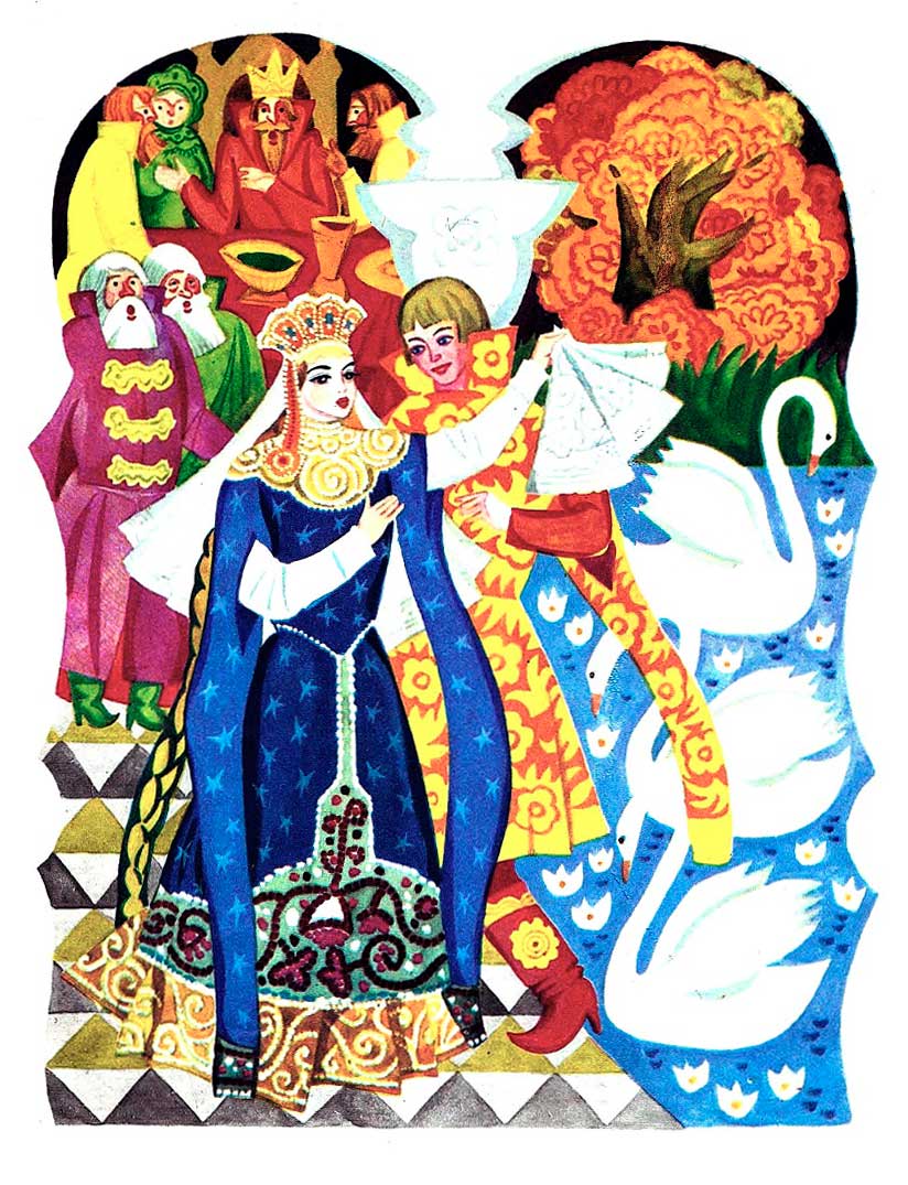 ⠀⠀ ⠀⠀ ⠀⠀ Стали гости есть, пить, веселиться. Василиса Премудрая испила из стакана да последки себе за левый рукав вылила. Закусила лебедем да косточки за правый рукав бросила. Жёны больших-то царевичей увидали её хитрости и давай то же делать. Попили, поели, настал черёд плясать. Василиса Премудрая подхватила Ивана-царевича и пошла. Уж она плясала, плясала, вертелась, вертелась — всем на диво. Махнула левым рукавом — вдруг сделалось озеро, махнула правым рукавом — поплыли по озеру белые лебеди. Царь и гости диву дались. ⠀⠀ ⠀⠀ ⠀⠀