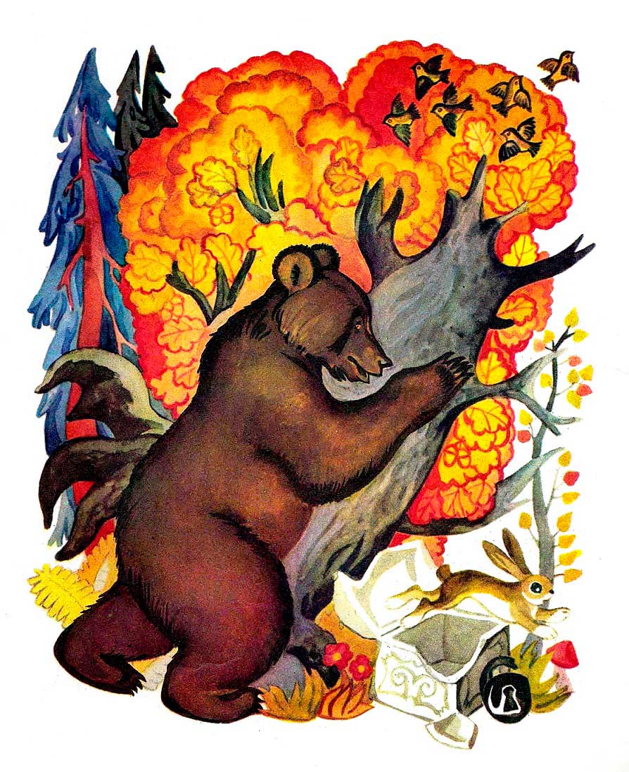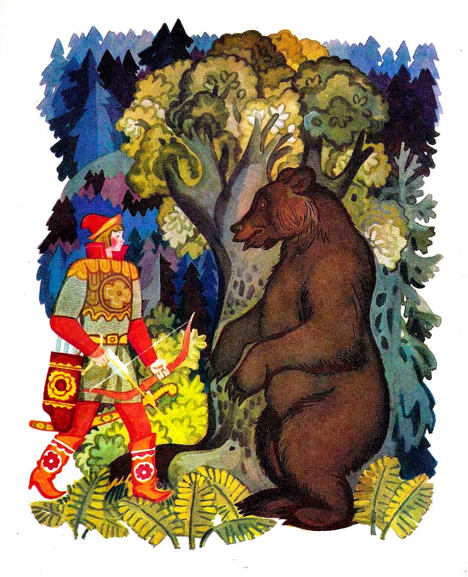 ⠀⠀ ⠀⠀ ⠀⠀ Иван-царевич пожалел медведя, не стал его стрелять, пошёл дальше. Глядь, летит над ним селезень. Он нацелился, а селезень говорит ему человеческим голосом: — Не бей меня, Иван-царевич! Я тебе пригожусь. Он пожалел селезня и пошёл дальше. Бежит косой заяц. Иван-царевич опять спохватился, хочет в него стрелять, а заяц говорит человеческим голосом: — Не убивай меня, Иван-царевич, я тебе пригожусь. Пожалел он зайца, пошёл дальше. Подходит к синему морю и видит: на берегу, на песке, лежит щука, едва дышит и говорит ему: — Ах, Иван-царевич, пожалей меня, брось в синее море! Он бросил щуку в море, пошёл дальше берегом. Долго ли, коротко ли, прикатился клубочек к лесу. Там стоит избушка на курьих ножках, кругом себя поворачивается. — Избушка, избушка, стань по-старому, как мать поставила: к лесу задом, ко мне передом. ⠀⠀ ⠀⠀ ⠀⠀