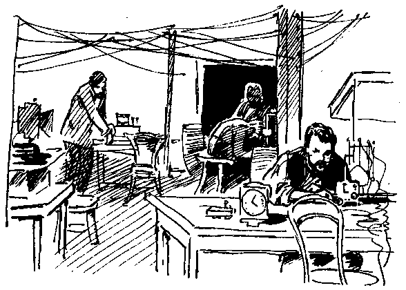 Автомобиль оказался небольшим потрепанным грузовиком. Штернберг сидел рядом с шофером, немолодым солдатом. А Гопиус, стоя на подножке, кричал Штернбергу, сидевшему у разбитого окна: — Слышите справа пулеметный — это наши у Бабьегородской плотины. Бабьегородские переулки у нас в руках, там наши накапливаются и с набережной наступают на Крымский мост. Но как пишут в сводках, с переменным успехом. А вот мы и дома! Грузовик круто развернулся у углового трехэтажного дома, стоявшего напротив маленького чахлого скверика посередине площади. Со стороны Коровьего вала они зашли в залы, где ничто уже не напоминало их ресторанное прошлое. И большая зала, и примыкающие к ней комнаты были полны вооруженных людей. Стульев не было, сидели на полу. У стен спали красногвардейцы и солдаты, не выпуская из рук винтовки. В углу стояли два стола, на них лежали караваи хлеба, миски с чем-то съестным. Густой табачный дым плавал в воздухе.