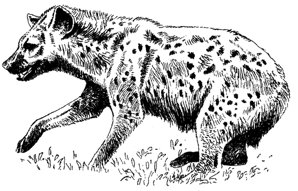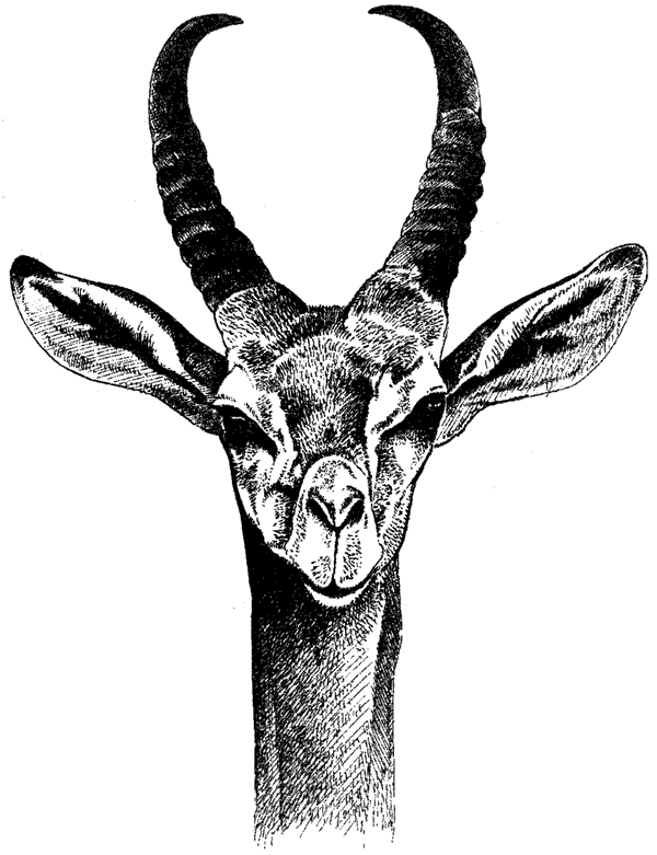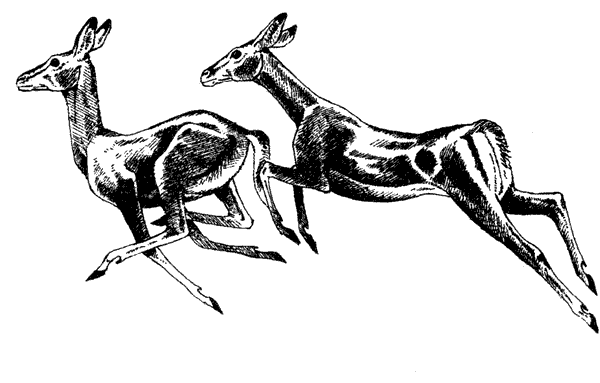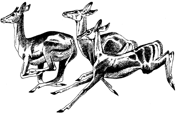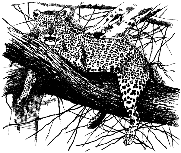 Покачав головой, Джордж направился к егерю. «Вапи Дэнис?» (А где же Дэнис?), — спросил он и принялся шарить по кустам фонарем. Со скалы, находившейся у самого лагеря, блеснули, словно звезды, янтарные глаза. Там неподвижно лежал трехлетний самец — он явно пребывал в нерешительности.