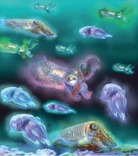 — Тебе надо ознакомиться с тем, что мы знаем о головоногих, — сказал Женя. Это произошло после того, как он научил меня пользоваться скафандром. Впрочем, особо учиться было нечему: скафандр был почти невесом и соответствовал моим параметрам просто идеально. С гравитатором было ещё проще, он управлялся мысленно, хотя и имел некоторые ограничения, чтобы я не мог нечаянно нанести себе вред. Я не знаю, как именно происходил процесс впитывания мной информации о головоногих моллюсках Земли. Просто двой ник надел мне на голову шлем с непрозрачными очками, и перед моими глазами замелькали изображения, а в ушах раздались повышающиеся в тоне звуки. Часть аудио- и видеоинформации я осознавал, но ещё больше всего из этого потока, видимо, прямиком отправлялась в мой мозг. Во всяком случае, через некоторое время я знал, что головоногие стали доминирующей группой моллюсков на Земле во время ордовикского периода. Туловище моллюсков со всех сторон одето мантией, которая на брюшной стороне образует мантийную полость с щелью. Из этой щели выступает трубка конической формы, которая обеспечивает реактивное движение. Особенно меня заинтересовала способность осьминогов парализовать добычу ядом, а затем изливать в неё ферменты, после чего полупереваренная разжиженная кашица, поступает в организм моллюска. В этом они были подобны паукам. Не менее своеобразными являются пигментные клетки головоногих — хроматофоры, с помощью которых они способны быстро менять окраску. Ну и конечно же я обратил внимание на то, что в заднюю кишку открывается проток так называемого чернильного мешка, то есть железы, выделяющей тёмную маскировочную жидкость. И ещё я запомнил, что их кровь содержит гемоцианин, богатое медью соединение, которое на воздухе синеет… — Не забывай: всё, что ты узнал, относится к земным головоногим, — сказал мой двойник, когда я снял шлем. — А здесь, при всём своём внешнем подобии, они, скорее всего, устроены значительно сложнее, а главное — иначе.* * *