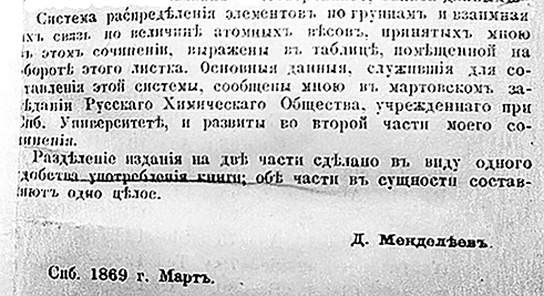 Как видно из этого извещения - указания на то, что таблица опубликована "на обороте этого листка" и римской нумерации страниц (основной текст имеет арабскую нумерацию), этот текст был дополнительно вставлен после составления таблицы. Более того, поскольку, как сообщает директор Музея-архива Д.И. Менделеева СПбГУ профессор И.С.Дмитриев, "Первый выпуск "Основ" был опубликован в конце мая или в начале июня 1868 года",{5}в печатном варианте учебника "Основы химии" эта вставка появилась не в составе первого выпуска (1868 г.), а после второго выпуска, "печатание которого было закончено в марте 1869 года"{6}. В марте 1869 года, сразу после ее открытия, помещать таблицу в издание учебника уже не было технической возможности. И, можно предположить, что именно желание Менделеева увидеть публикацию первого варианта своей таблицы и подвигло его издать "полнокровный учебник", который состоял из сброшюрованных первого и второго выпусков и вклейки ("Предисловии") с таблицей. Так и появилось издание, известное теперь как "Основы химии. Часть 1", издание первое. Оно и прославило автора, поскольку таблица стала доступной "просвещенной публике", в первую очередь - студентам Университета.