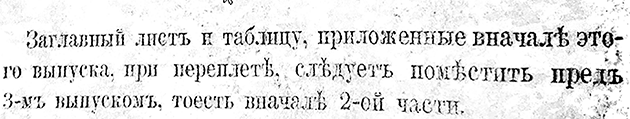 Это единственный экземпляр книги в фондах РГБ, в котором сохранилось вложение с таблицей. Вложение напечатано на тонкой "папиросной" бумаге, становящейся с течением времени весьма хрупкой, вклейка сложена вчетверо для того, чтобы поместиться под обложкой, в результате чего в данном экземпляре вклейка оторвалась по сгибу. Вероятно, эта полиграфическая особенность затрудняла читателям пользование ею и привела к утрате вложения в других сохранившихся в библиотеке экземплярах. В дальнейшем, в следующих изданиях, таблица была компактифицирована и помещалась на одном листе вклейки.
