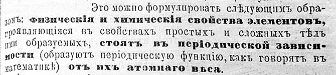 "... закон периодичности можно сформулировать следующим образом: свойства элементов, а потому и свойства сложных тел, состоит в периодической зависимости (то есть правильно повторяются) от их атомного веса".{43}