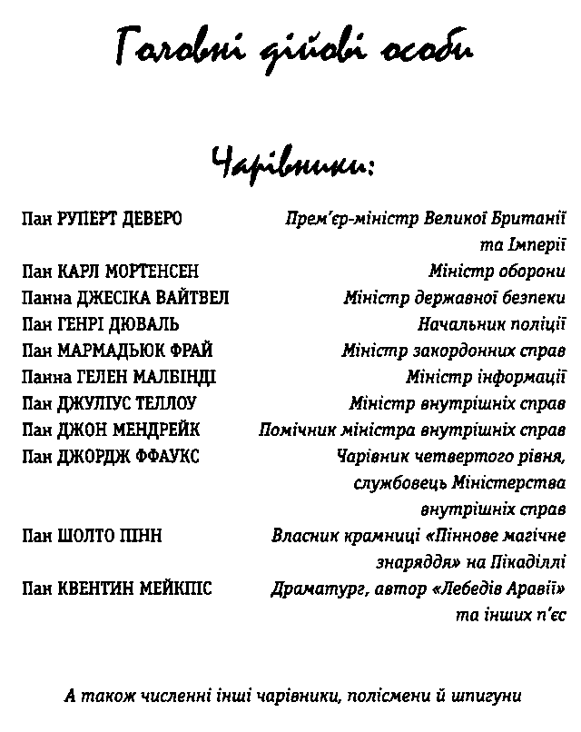 У кабінеті Натаніеля зустріли гнівний погляд секретаря й здоровенний стос свіжих паперів у лотку для вхідних документів. Секретар, ошатний молодик із прилизаним рудим волоссям, затримався на порозі кабінету. — Ви запізнились, Мендрейку, — сказав він, поправля-ючи окуляри різким, нервовим порухом. — Чим ви цього разу виправдаєтесь? У вас теж є певні обов'язки, так само, як у постійних співробітників! Він стояв на дверях і сердито супився, задерши коротенького носа. Чарівник умостився в кріслі. Йому кортіло закинути ноги на стіл, та це видавалося б надто зухвалим. — Я виїздив на місце пригоди з паном Теллоу, — недбало промовив він. — Працював там з шостої години. Якщо не вірите, спитайте його, коли він прийде. Може, він повідомить вам кілька подробиць, якщо це, звичайно, не секретна інформація. А ви що робили, Дженкінсе? Натхненно копіювали документи, еге ж? Секретар засичав крізь зуби й знову поправив окуляри. — Гаразд, гаразд, Мендрейку, — процідив він. — Байдикуйте далі. Поки що ви прем’єрів улюбленець, та чи довго це триватиме, якщо ви не виправдаєте його надій? Ще одна пригода? Друга за тиждень? Скоро ви знову митимете чайний посуд, і тоді... от побачите! Сказавши це, він пішов собі — а може, втік. Хлопчина скорчив гримасу в бік дверей і кілька хвилин сидів, втупившись поглядом перед собою. Потім стомлено протер очі й поглянув на годинник. Лише дев’ята сорок п’ять! Як довго тягнеться день! Його увагу привернув стос паперів на столі. Хлопець зітхнув, поправив манжети й потягся за горішньою текою.