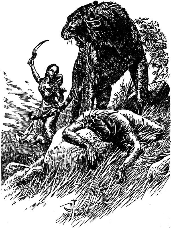 Дойдя до оврага, где была убита женщина, люди остановились и стали совещаться, как быть дальше. Но все споры прекратил тигр, громко заревевший в кустах, отстоявших ярдах в тридцати. Как один человек вся партия повернула и побежала в деревню. Когда отдышались, посыпались взаимные упреки: кто побежал первым, кто вызвал панику? Долго спорили, пока наконец кто-то заметил, что если никто не испугался и все были храбры, как утверждали, то зачем же терять время и почему не вернуться, чтобы попытаться спасти женщину.