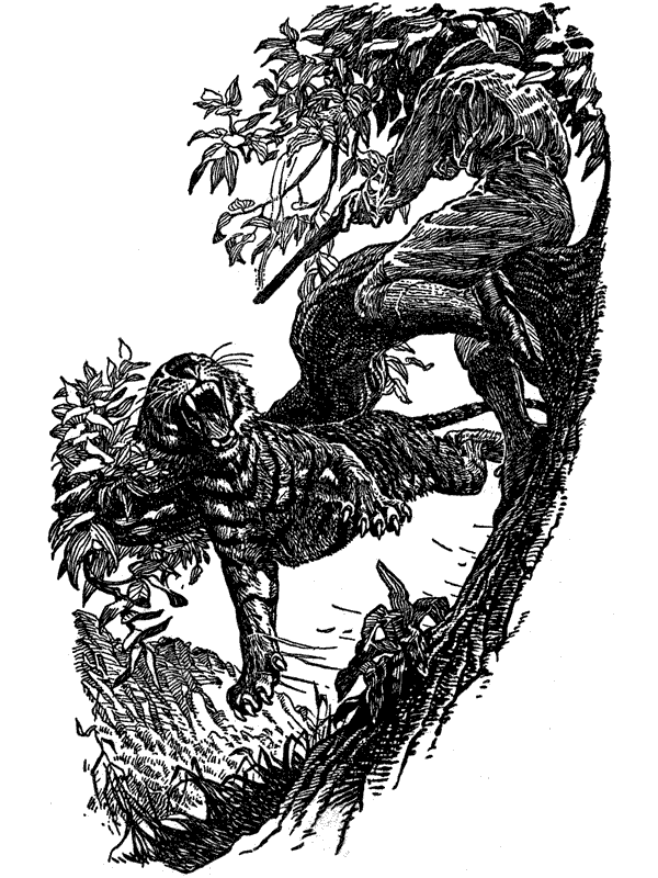 После легкой закуски, которая должна была заменить мне обед, я, удостоверившись, что мои люди находятся в безопасности в закрытом помещении, занял пост на краю дороги, прислонившись спиной к дереву. Жители деревни рассказывали, что тигр обычно ходит по этой дороге. Было полнолуние, и я надеялся, что мне представится случай сделать удачный выстрел, если я увижу тигра раньше, чем он меня.