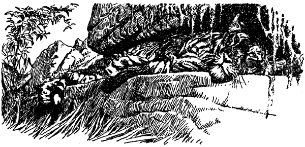 По возвращении в деревню я хотел попросить жителей (они были изумлены, как я остался живым в эту ночь) указать места, где нападал на них тигр. Желающих не нашлось. Крестьяне только показывали мне со двора те направления, которые вели к местам гибели людей. Последний случай произошел на склоне горы к западу от деревни; сюда меня все же проводили. Женщины с детьми (всех их было около двадцати) занимались сбором листьев для скота, когда одна из них была убита. С волнением передавали мне они детали этого происшествия. Женщины вышли из деревни часа за два до полудня. Пройдя около полумили, они стали влезать на деревья и срезать листву. Жертва людоеда и две другие женщины выбрали себе дерево, растущее у края оврага. В дальнейшем я выяснил, что овраг этот имел в глубину около четырех футов, а в ширину — от десяти до двенадцати. Срезав листья, женщина стала спускаться с дерева. Незаметно подкравшийся тигр схватил ее за ногу. Женщина после неимоверных усилий выпустила из рук сук, за который держалась при спуске, а тигр сбросил свою жертву в овраг. Когда женщина пыталась встать, тигр, схватив ее за горло, убил, а потом выскочил по склону оврага и исчез со своей добычей в густых кустах.