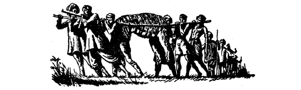 Срезав два молодых деревца, прочно привязали к ним труп тигрицы снятыми чалмами, поясами и набедренными повязками. Когда все было готово, носилки подняли, и мы двинулись к подножию крутого склона. Люди предпочли нести тигрицу вверх по горе, на противоположном склоне которой располагались деревни, а не идти по густо заросшему лесом склону, где происходил загон. При помощи простого способа образовались две людские цепи: каждый шедший позади крепко держался за пояс или другую часть одежды идущего впереди. Когда я решил, что людей для переноса тигра достаточно, они окружили носилки, чтобы при надобности поддерживать носильщиков и служить им опорой. Вся процессия двинулась вверх по горе.