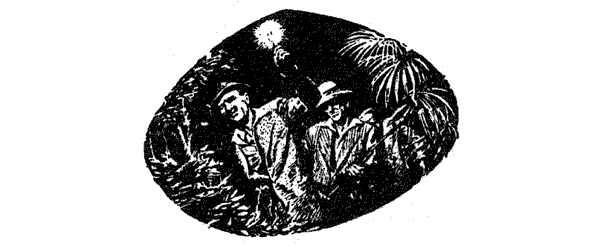 После того как пандит и его десять гостей кончили свою вечернюю трапезу, они заперлись в этой комнате, в которой совершенно не было никакого приспособления для вентиляции. Духота там была невероятная, и, боясь обморока, пандит среди ночи открыл дверь, вышел наружу, потянулся и, раскинув руки, взялся за столбы, стоящие с каждой стороны ступеней лестницы и поддерживающие крышу веранды.
