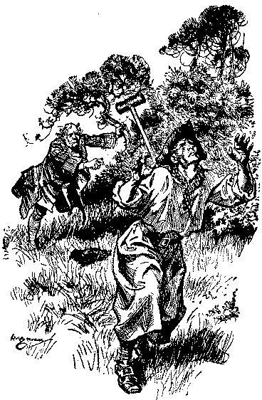 Оказалось, что любопытство мое было сильнее страха. Я не мог усидеть на месте. Осторожно вылез я в ложбинку и спрятался за кустом ракитника. Отсюда я отчетливо видел дорогу перед дверью трактира. Едва я занял свой наблюдательный пост, как появились враги. Их было человек семь или восемь. Они быстро приближались, громко и беспорядочно стуча башмаками. Человек с фонарем бежал впереди всех. За ним следовали трое, держась за руки. Несмотря на туман, я разглядел, что средний в этом «трио» — слепой нищий. Затем я услышал его голос и убедился, что был прав. — К черту дверь! — крикнул он. — Есть, сэр! — отозвались двое или трое. И они кинулись в атаку на дверь «Адмирала Бенбоу»; человек с фонарем шел сзади. У самой двери они остановились и принялись совещаться шепотом. Очевидно, их поразило, что дверь не заперта. Затем опять раздались приказания слепого. Нетерпеливый, свирепый голос его становился все громче и визгливее. — В дом! В дом! — кричал он, проклиная товарищей за медлительность. Четверо или пятеро вошли в дом, двое остались на дороге вместе с ужасным нищим. Потом после нескольких минут тишины раздался крик удивления и чей-то голос завопил изнутри: — Билли мертвый! Но слепой снова выругал их за то, что они так копаются. — Обыщите его, подлые лодыри! Остальные наверх, за сундуком! — приказал он. Они застучали башмаками по ветхим ступеням, и весь дом задрожал от их топота. Затем снова раздались удивленные голоса. Окошко в комнате капитана распахнулось настежь, и вниз со звоном посыпались осколки разбитого стекла. Из окна высунулся человек. Голова его и плечи были хорошо видны при свете месяца. Он крикнул слепому нищему, стоявшему внизу на дороге: — Эй, Пью, здесь уже успели побывать раньше нас!.. Кто-то перерыл весь сундук снизу доверху! — А то на месте? — проревел Пью. — Деньги тут. — К черту деньги! — закричал слепой. — Я говорю о бумагах Флинта. — Бумаг не видать, — отозвался человек. — Эй вы, там, внизу, посмотрите, нет ли их на теле! — снова крикнул слепой. Другой разбойник — вероятно, один из тех, кто остался внизу обыскивать труп капитана, — появился в дверях трактира. — Его успели обшарить до нас, — сказал он. — Нам ничего не оставили. — Нас ограбили здешние люди. Этот тот щенок! — крикнул Пью. — Жаль, что я не выколол ему глаза… Эти люди были здесь совсем недавно. Когда я хотел войти, дверь была заперта на засов. Ищите же их, ребята! Ищите во всех углах… — Да, они были здесь. Они оставили горящую свечу, — сказал человек в окне. — Ищите! Ищите! Переройте весь дом! — повторил Пью, стуча палкой. И вот в нашем старом трактире начался ужасный кавардак. Тяжелые шаги загремели повсюду. Посыпались обломки разбиваемой мебели, захлопали двери вверху и внизу, так что даже окрестные скалы подхватили этот бешеный грохот. Но все напрасно: люди один за другим выходили на дорогу и докладывали, что не нашли нас нигде. В это мгновение вдали снова раздался тот самый свист, который так напугал мою мать и меня, когда мы считали монеты покойного. На этот раз он прозвучал дважды. Прежде я думал, что этим свистом слепой сзывает своих товарищей на штурм. Но теперь я заметил, что свист раздается со стороны холма, обращенного к деревушке, и догадался, что это сигнал, предупреждающий бандитов об опасности. — Это Дэрк, — сказал один. — Слышите: он свистит два раза. Надо бежать, реб