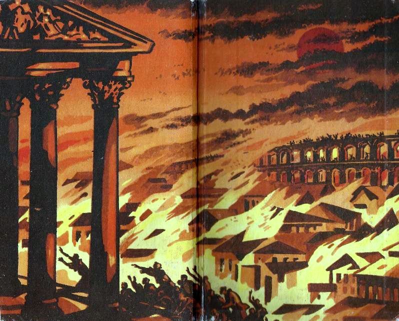 Зарево пылающего города освещало небосвод по всей его окружности. Из-за холмов выкатилась большая полная луна, которая сразу же раскалилась докрасна и, приобретя цвет расплавленной меди, казалось, взирает с изумлением на гибнущий город, владыку мира. В алых безднах небес светились алые звезды, но в отличие от обычных ночей на земле было светлее, чем на небе. Подобно гигантскому костру, Рим освещал всю Кампанию.[350] При кровавом этом зареве были видны дальние холмы, селения, виллы, храмы, памятники и акведуки, сбегающие со всех окрестных гор к городу, а на акведуках — скопления людей, забравшихся туда ради безопасности и чтобы наблюдать пожар. Тем временем бушующая стихия захватывала все новые участки. Не могло быть сомнений, что чьи-то преступные руки поджигают город, так как новые очаги пожара вспыхивали в местах, расположенных далеко от главного его очага. С холмов, на которых располагался Рим, потоки пламени стекали, наподобие волн морских, в долины, густо застроенные пяти- и шестиэтажными домами, множеством сараев, лавок, деревянных передвижных амфитеатров, сооруженных наспех для различных зрелищ, и, наконец, складов с дровами, оливковым маслом, зерном, орехами, шишками пиний, семенами которых питался бедный люд, с одеждой, которую по велению милостивых императоров раздавали голытьбе, гнездившейся в закоулках города. Там было обилие горючих материалов, гулкие взрывы следовали один за другим, и пожар с невиданной быстротой охватывал целые улицы. Расположившиеся за городскою стеной и забравшиеся на акведуки горожане угадывали по цвету пламени, что горит. Неистовые порывы горячего ветра то и дело приносили из огненной пучины мириады раскаленных ореховых и миндальных скорлупок, взвивавшихся роями сверкающих бабочек, — с треском лопались они в воздухе или, гонимые ветром, сыпались вниз на новые, еще не загоревшиеся участки, на акведуки и окружавшие город поля. Казалось, о спасении нечего и думать — смятение все возрастало, так как жители города бежали из всех ворот за его пределы, а навстречу горожанам шли привлеченные пожаром тысячи людей из окрестностей, жители небольших селений, а также крестьяне и полудикие пастухи из Кампании, соблазняемые надеждой на безнаказанный грабеж. Возглас «Рим гибнет» не смолкал в устах толпы — а гибель города представлялась в те времена также концом его господства и разрешением всех уз, связывавших доселе народ в единое целое. Скопища черни, в большинстве состоявшей из рабов и чужестранцев, для которых владычество Рима ничуть не было дорого, а переворот мог быть лишь освобождением от гнета, приобретали то тут, то там угрожающий вид. Насилие и грабежи распространялись безудержно. Можно было подумать, что единственно лишь зрелище гибнущего города, приковывая к себе внимание, сдерживает взрыв буйства, которое развернется во всю силу, как только город превратится в пепелище. Сотни тысяч рабов, позабыв о том, что Рим — это не только храмы и стены, но еще и десятки легионов во всех концах мира, казалось, ждали только клича и вождя. Поминали имя Спартака — но Спартака не было, зато римские граждане стали объединяться и вооружаться кто чем мог. Самые фантастические слухи кружили у городских ворот. Некоторые уверяли, что это Вулкан, по велению Юпитера, уничтожает город исходящим из земли огнем; другие — 