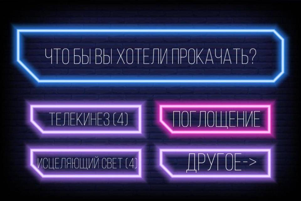 Ваша нынешняя статистика выглядит подобным образом: Имя: Яр; Раса: человек; Класс: простолюдин, раб; Уровень: 4; Очки уровня: 42 из 100; Монеты: 25; Ловкость: 20; Интеллект: 18; Сила: 12; Особые навыки: поглощение, водяные копья, морской дракон, созидание, телекинез (х4), исцеляющий свет (х4), дрожь земли… Хп: 176; Мана: 212; КЧ: 4. Что бы вы хотели прокачать?