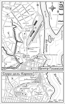На півдні від Інституту неврології здіймається видовжений зі сходу на захід пагорб Серро-дель-Кармен, північний схил якого вкривають справжні хащі. Якщо поглянути з висоти пташиного польоту, пагорб є практично правильним прямокутником, довжина якого становить п’ятсот метрів, а ширина — трохи менше ніж двісті. Найвища точка знаходиться у західній його частині: її висота над рівнем моря складає сімдесят вісім метрів. Небагато, однак слід пам’ятати, що Ґуаякіль розкинувся в гирлі річки Ґуаяс, на нульовій позначці, через що висота сімдесят вісім метрів видається не такою вже й незначною. Під пагорбом пролягають два автомобільні тунелі. Túnel 1 починається біля південно-східного кута бетонної загорожі Інституту неврології, пірнає під 10-ту Північно-Східну вулицю і виходить на поверхню на двісті метрів південніше, де вливається в 6-ту Південно-Східну вулицю, відому також за назвою авеню Бояка́. Túnel 2 — це продовження витягнутої вздовж річки 12-ї Південно-Східної вулиці (авеню Малеко́на Симона Болівара), що спускається під землю на східному схилі Серро-дель-Кармен і виринає за кілька кроків від входу до Túnel 1. Північний, укритий хащами схил, є найкрутішим: відразу за 10-ю Північно-Східною вулицею він під кутом 45° сягає у висоту десятиповерхового будинку. Східний схил, який полого спускається до вулиці Хасінто де Буітрóуна, тісно забудований бідацькими халупами та нагадує бразильські фавели в Сан-Паулу чи Ріо-де-Жанейро. На більш-менш рівній вершині пагорба розташовано госпіталь Луїса Вернаси — одну з найдавніших лікарень Південної Америки, фундовану ще іспанськими колоністами 1564 року. Звивиста дорога від головного корпусу лікарні веде до оглядового майданчика, з якого не загиджений висотками Ґуаякіль видно як на долоні. На південному заході під Серро-дель-Кармен розкинулося старовинне кладовище Cementerio General de Guayaquil. Некрополь заснували за наказом губернатора Ґуаякіля ще 1843 року для поховання еквадорських вельмож. Розміщений тоді на околиці міста, на сьогодні він перетворився на одну з найвизначніших пам’яток Ґуаякіля. Цвинтар усіяний помпезними гробницями та мармуровими мавзолеями, серед яких — могила відомого еквадорського ліберала та реформатора, одного з перших президентів Еквадору, генерала Хосе Елоя Альфаро, а також ще чотирнадцяти президентів республіки. Розкішні обеліски й усипальниці Cementerio General є справжніми витворами мистецтва, чимало з яких можуть затьмарити найкращі склепи на Личаківському цвинтарі. Водночас, як і на Личаківському кладовищі у Львові, багато поховань ґуаякільського некрополя під натиском вітру та негоди почали помалу руйнуватися й осідати, через що здавалося, наче зневажені відсутністю уваги мерці намірилися затягти власні пам’ятники під землю.XL