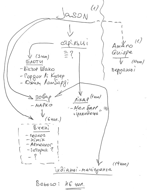 На першому плотові їх було троє. Попри густий туман, Тор Сандерс розгледів, що всі небіжчики — індіанці мачігуенга[12]. Одного з мерців розіпнули зірочкою, прив’язавши руки й ноги в кутах прямокутного плота. Голову бідолахи відокремили від тіла та прибили кілком через горло до живота. Понівечена голова виглядала від засохлої крові аж чорною. Два інші тіла лежали з боків від розіпнутого мачігуенга. Одяг пошматований, брудний, замащений кров’ю; у кожного покійника не вистачало лівої руки.