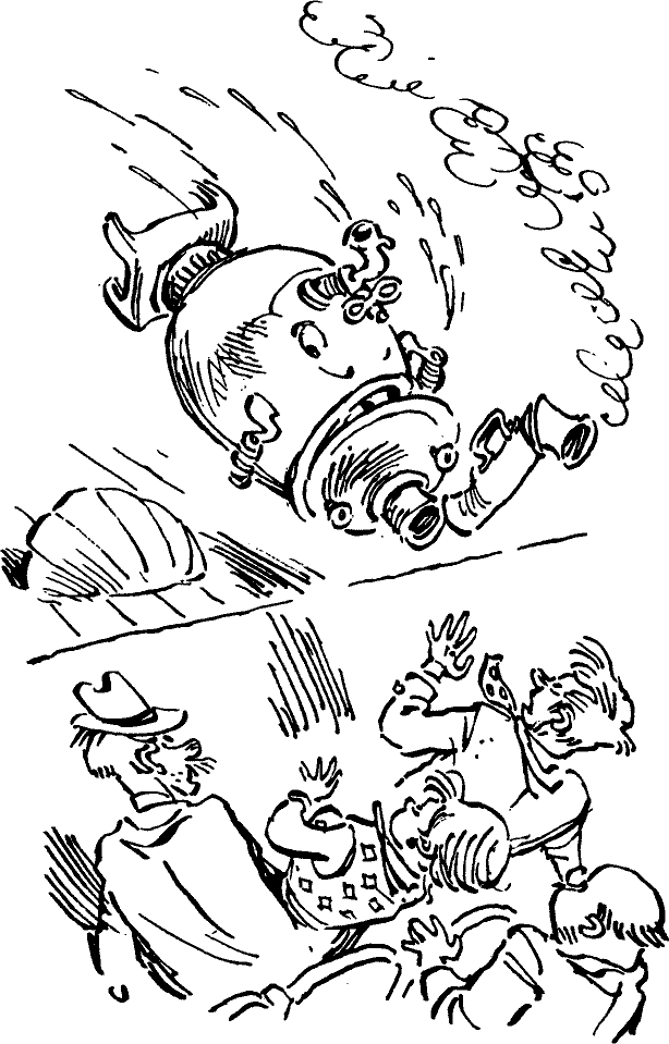 — Начнем, — сказал Фуго своему ассистенту. — Поехали, — ответил Алеша. Около часа Алеша с Фуго показывали восхищенным зрителям фокусы. Мимикр превзошел самого себя. Под черным покрывалом он принимал вид всех известных ему животных, предметов и даже совершенно непонятных агрегатов. То прикинется телевизором со встроенной мясорубкой, то микроволновой печью с пропеллером, и каждый раз публика требовала продолжения представления. За час выступления Фуго так сильно устал, что позабыл, во что ему превратиться, чтобы стать самим собой. И тогда Алеша сказал зрителям: — Все, выступление окончено. Инопланетянин забыл, как он выглядит. Следующий номер объявит Степан Николаевич. Но собравшиеся так неистово захлопали и засвистели, что артисты присели на корточки и зажали уши. И все же обещанный полет, пусть не кипящего, но самовара, состоялся. Увидев, что соотечественник изнемог и вконец раскис, Артур Игоревич поспешил ему на помощь. Он продрался сквозь толпу, взошел на сцену и поднял руки, призывая зрителей к тишине. — Смертельный номер! — закричал Артур Игоревич. — Самовар, летающий по системе Станиславского![22] — Это как же? — спросили у него из толпы. — А так, — ответил Артур Игоревич. — Это значит, во время полета я верю, что мой папа был самоваром и мой дедушка тоже был самоваром. И прадедушка и прапрадедушка. А еще я верю, что мои мама, бабушка, прабабушка и прапрабабушка были птицами. А если я родился от самовара и птицы, значит, я летающий самовар. Пока Артур Игоревич разговаривал со зрителями, Алеша с Фуго спустились вниз и смешались с толпой. Мимикру хотелось сейчас только одного — лечь на свой любимый диван и поспать часок-другой. — И зачем вся эта суета? — зевая, спросил он. — Это же праздник, — ответил ему Алеша. — Ну, сели бы за стол, хорошо поели, рассказали бы друг другу что-нибудь веселенькое. Это я понимаю, — скучным голосом пробубнил он. — А здесь целая тысяча человек в каких-то дурацких одеждах скачут по деревне как ненормальные, а я им еще и фокусы показываю. — Так это же карнавал, — сказал Алеша и удивленно посмотрел на своего друга. — Я, пожалуй, пойду домой, — слабым голосом проговорил Фуго. — Какие-то вы, земляне, взбалмошные. Еды у вас, конечно, много и диваны мягкие, но так вот беситься-то зачем? А Артур Игоревич закончил говорить и перешел к делу. Он удалился в конецсцены и принял вид большого медного самовара, в котором запросто поместилось бы десять ведер воды. Затем у самовара появились коротенькие крылья, и профессор ботаники басом прогудел: — Внимание, старт! Зрители, замерев, ждали, что будет дальше. И тут чудо-самовар тяжело взмахнул блестящими крыльями и вразвалочку побежал по сцене. Артур Игоревич топал, словно лошадь, и так неуклюже подпрыгивал, что собравшиеся начали смеяться. А когда профессор ботаники подбежал к краю сцены, он крикнул: «Поберегись!» — подпрыгнул и плюхнулся прямо на ближайших зрителей.