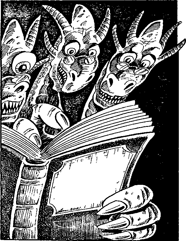 Это был не талон, а лотерейный билет. Всего лишь старый лотерейный билет. Прошлогодний лотерейный билет, зеленый. В этом году они розовые. Лотерейный билет — всего лишь. Просроченный прошлогодний билет. — Нет, еще не просроченный! — суетился кто-то. — Гляди, что написано: «Выдача выигрышей производится до 15-го линюля Очередного Года. Сегодня — пятнадцатое. А год какой? Какой год, кто помнит?.. Позапрошлый был Последующий, прошлый — Текущий, а сейчас какой?.. Очередной! Значит, сегодня истекает последний день! Так чудесно день начинался и так плохо продолжается. Уже истекает… На физиономию Кащея пытались не смотреть. Физиономия была такая, что никто не смел зубоскалить, — тем более, рядом приглядывался Глухой Черт: не обижает ли кто дружка?.. Воротили сочувственные рыла. Всем известно: бесы в лотерею не выигрывают. Ну, возможно, иногда сойдется серия, и бес выиграет талон на обед в ресторации. Ну, выиграет, но какой же бес станет мотаться за этим обедом в ресторацию к Ядру Системы? Тем более, сегодня истекает последний день. Лишь Глухой Черт не терял надежды. Он свернул газетку и вытащил нож. Его знаки означали: «Сейчас проверим. Иди за мной.» Кащей с неохотой поплелся за своим опасным другом. За ними увязались старый бес-библиотекарь и прочие сочувствующие. Глухой Черт, нарушая все свои железные принципы, полез к окошку Биржи без очереди. Никто не осмелился возражать, а самые отпетые бесы восприняли как должное. В биржевом окошке сидел очкастый организм с талантом младшего экономиста — кассир, то есть. Это удостоверял медный значок на лацкане. Видел-то он хорошо, а очки с простыми стекляшками носил для форса и пущей важности протирал их перед бесами. — Почему без очереди-шмочереди? — строго спросил кассир (он виртуозно говорил в рифму). — Да сколько вас ТУТ, мать вашу ТРУТ? Ему объяснили: надо проверить лотерейный билет. — Лотерея-блатерея… — забормотал кассир и швырнул друзьям пачку прошлогодних лотерейных таблиц. — Следующий-заведующий! Глухой Черт повел пальцем по строкам. Ему мешали, толкали в спину. Он защелкнул лезвие ножа и опять потащил палец от серии с номером к столбцу выигрышей:Серия, номер…………………………….. выигрышУ Кащея появилось предчувствие. Он на себя прикрикнул. Глухой Черт в третий раз провел пальцем и замычал. На его языке это означало высшую степень потрясения. — Ты что-то выиграл! — объяснили Кащею. За Глухого Черта стали читать другие: — Серия… Серия… Сошлась серия… Считай, обед в ресторации выигран! Номер… Номер… Сошелся номер!.. — дрожащий палец метнулся к столбцу выигрышей. — Талант штаханиста-профессионала!.. Нет, мимо… — Не умеешь! Дай я… Серия номер… Талант коми… комирсанта… Мимо. Очередь напирала. Кащей глотал слюну. Глухой Черт в глубокой задумчивости чистил ногти ножом. Кто-то разглядывал билет на просвет. Кассир сдвинул очки на лоб и высунулся: — Что, фальшивый? — с надеждой спросил он. — Сам ты… — Дай сюда! — потребовал кассир. Ему с неохотой отдали таблицу. Он повел пальцем по строке. Он не поверил своему пальцу и строго на него посмотрел. Указательный палец — инструмент кассира. Как напильник для слесаря. Инструмент подводить не должен. На него поплевывают, им считают, пересчитывают, подписывают ведомости, ковыряют в носу. Иногда указательным пальцем показывают на непонравившегося беса, и того уво