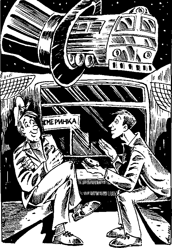 «Вечерний экспресс» (немытая коробка, доживающая свои дни на силовых ухабах этой бесталанной провинции) притормозил, и Кащей с Глухим Чертом вскочили в заранее приоткрытый шлюз. Их встретила смазливая стюардесса в элегантном дамском скафандре и провела в служебный салон вне видимости пассажиров. Там она прибрала их доспехи и сняла скафандрик, оставшись в одном кружевном белье (в таком виде и разгуливала по салонам). Кащей тут же по уши влюбился в нее, а Глухой Черт подмигнул и ободряюще воспроизвел тот неприличный жест, из-за которого пострадал сегодня биржевой кассир. — Руки держим при себе, договорились? — сказала Матильда (это имя было вышито на карманчике скафандра). — Это вы в лотерею талант выиграли? Значит, будете всю жизнь рифмовать?.. Скука… Но тоже занятие. Сейчас нас поздравит командир. Экипаж знает, что вы мой жених. Да, да, жених, у тебя плохой слух? Раз в сезон каждый член экипажа имеет право провезти в «Экспрессе» одного родственника. Жених — это что-то вроде родственника, верно? Наш командир, хотя и не питает любви к бесам, но без предрассудков. Сочувствует. Он направляется к нам. Улыбайся. Не вздумай волочиться за мной по-настоящему… Я сама скажу, когда захочу… Командир поздравил жениха и невесту. Кащею даже говорить не пришлось. Он, командир, счастлив познакомиться с поэтом, или, во всяком случае, с бесом, собирающимся поэтом стать. Система оскудела поэтами, вы не находите? Нет, рифмуют, конечно… «Грозы-стервозы…» Да что толку? Немудрено, с тех пор как началась эта гонка за бессмертием, все как будто оглохли и онемели. Живого слова не услышишь, кроме мата. Он, командир, сделает все, от него зависящее… А это кто с вами? Брачный свидетель? Один из тех, кто оглох и онемел?.. Когда словоохотливый командир удалился, Матильда принесла жениху и свидетелю скромный звездолетный ужин — чай с пирожками. Они ели сегодня впервые. — Теперь ты — наш! — объяснила Матильда, поправляя опавшую бретельку лифчика. — А ты ничего, скромный. Не сердись. Я б тебе отдалась, но сейчас не время. Потом, ладно? Твой спутник — командир боевой подпольной организации бесов. Законсервирован, законспирирован и замаскирован, но сегодня решил раскрыться и стать твоим личным телохранителем. Его настоящего имени никто не знает, даже я. Большого ума бес. Отличный организатор, агитатор и пропагандист. — Кто агитатор-пропагандист?! — поразился Кащей. — Он же говорить не умеет — не то что двух слов связать! — Но он тебе все здорово объяснил… Слова — пустой звук. Голая мысль в чистом виде — вот его идеал. Он умеет донести голую мысль в чистом виде… Телепатия, спрашиваешь? Не знаю. Он все слышит и умеет говорить, но дал обет молчания до полного освобождения бесов! Это — мужик! Ему б я тоже отдалась! Кащей, жуя пирожок, с уважением поглядел на Глухого Черта. «Не знаю, о чем вы там говорите, но женщина не права, — всем своим видом отвечал Глухой Черт. — В начале было Слово, и слово будет в конце. Потому-то я и молчу — о чем говорить в промежутке, зачем городить слова? Пусть говорят поэты; поэзия бессмертна — она спасет мир. Ты во что бы то ни стало должен добыть талант поэта, и тогда мы освободим бесов. Я доведу тебя до Лотерейного Центра. Не беспокойся, стрелять тебе не понадобится. Стрелять и резать буду я, а тебе достаточно ядерной гранаты… — Глухой Черт утер рукавом губы, доп